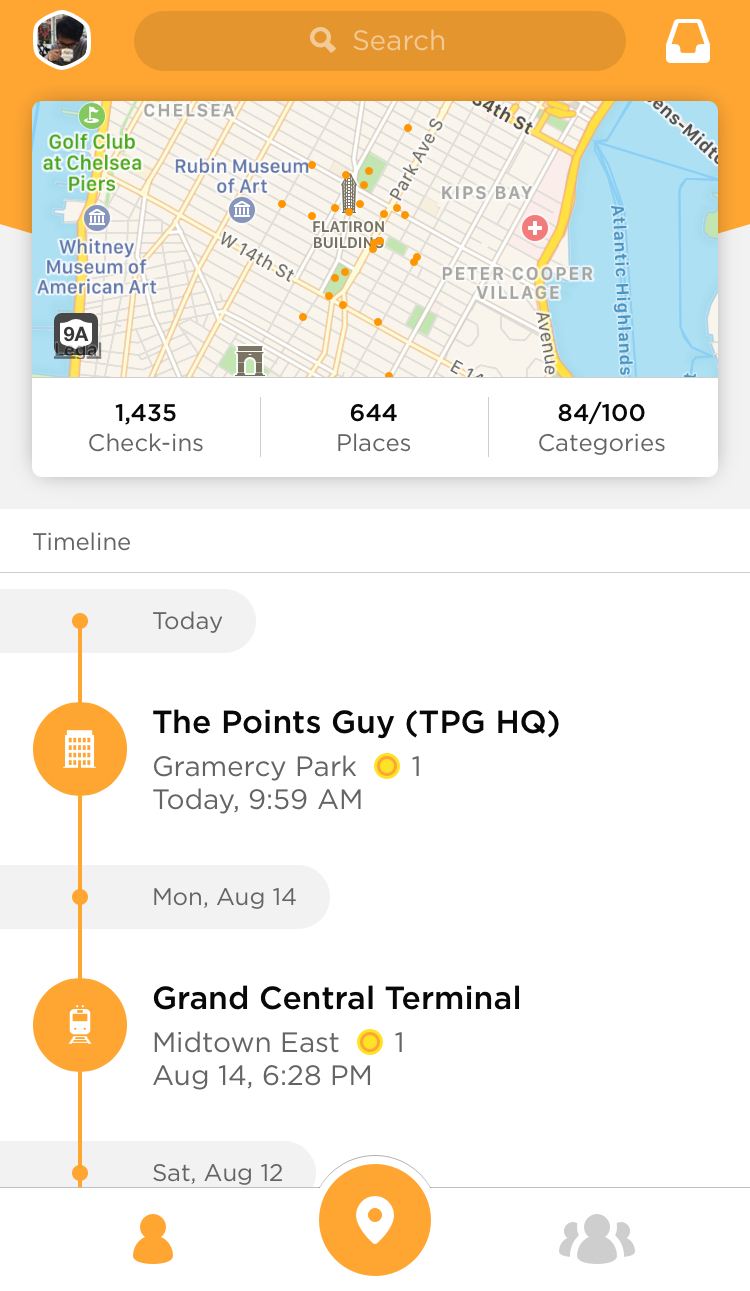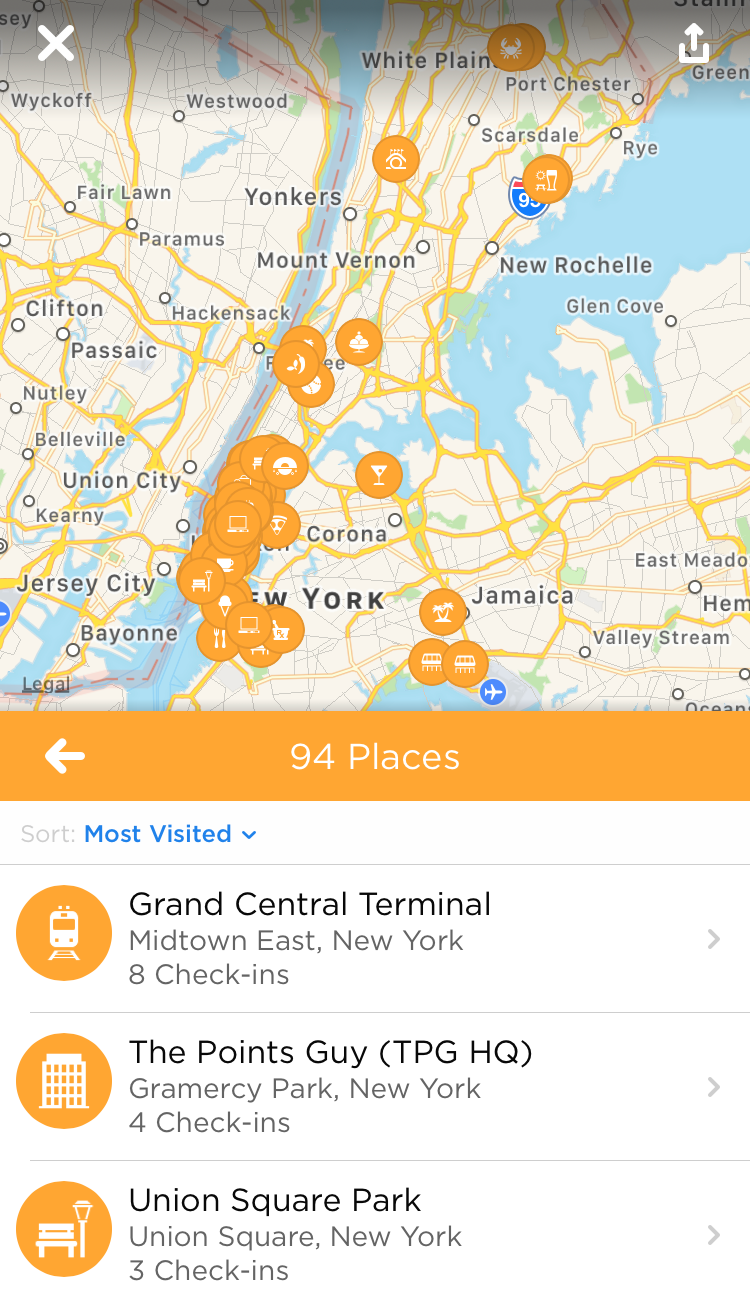 You can also learn more about your activity by tapping onto the orange bubbles. My most-visited spot in New York is Grand Central Terminal, which I go through every day on my way to my next most-visited location, TPG headquarters. What isn't accurate is the amount of check-ins — I know that I've visited GCT more than eight times — although in fairness, I didn't actively start checking into locations again until the second week of August. If you don't want anyone to know what you're up to, there's also the option to do "off-the-grid" check-ins, which makes your information private.