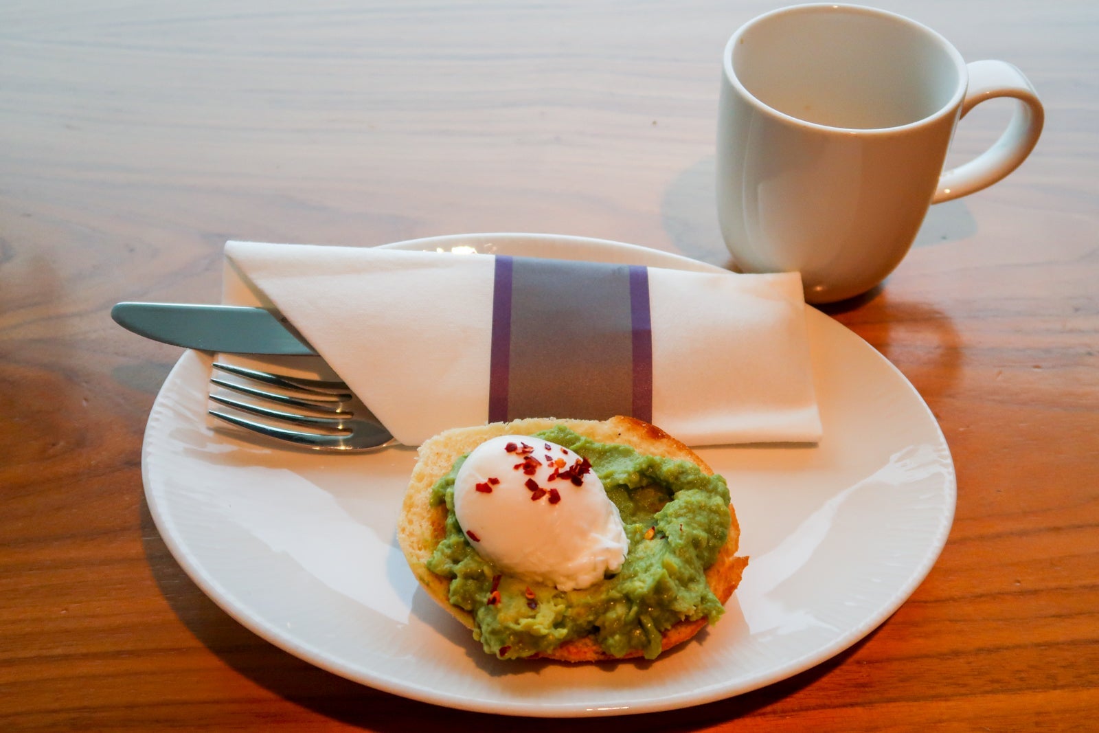 Set up and ready for some work before my flight, I headed to the bar to order something to eat. What I'd forgotten is that you could only order once from the menu and had to hand it in when ordering. Breakfast options before 11 a.m were poached egg (singular) and avocado muffin, classic sausage sub and toast and preserves. I was absolutely starving and love my eggs in the morning, so it was an easy decision to make.