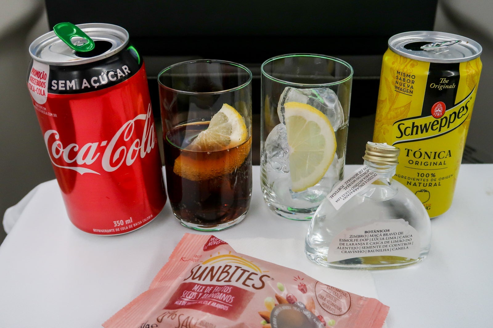 Back to the main event, Porto to Newark. For some reason there was no preflight drink offered before takeoff. About 45 minutes after takeoff, the first drinks were served — note the Coke Zero and gin and tonic theme. I like airlines that serve regular Coke, Diet Coke and Coke Zero. I wasn't a massive fan of the Sunbites, though.