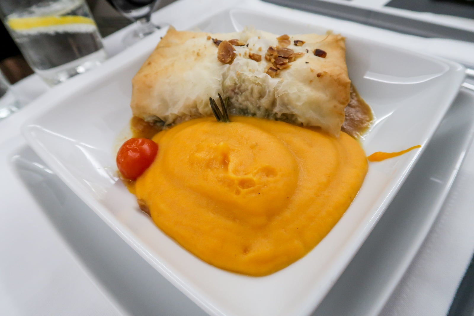 The main course, just as was the case on the Gatwick-to-Porto flight, was my favorite part. The heartier and more comforting the food, the bigger the thumbs up from me it usually gets, and this was definitely up there with one of my favorites. It was roast lamb in a crispy dough with pumpkin purée. As much as I've pretty much cut out red meat from my diet, I couldn't resist the sound of this, and I'm so glad I chose it.