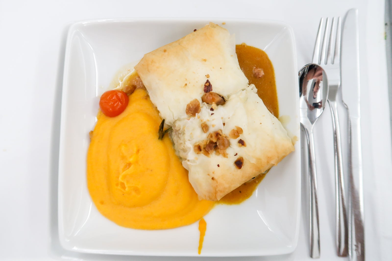 A full meal was served with sizable starter, delicious main course and dessert. The main course was a thick, juicy and perfectly cooked veal tenderloin. I would go as far as to say that it was the best intra-European business-class meal I have ever eaten.