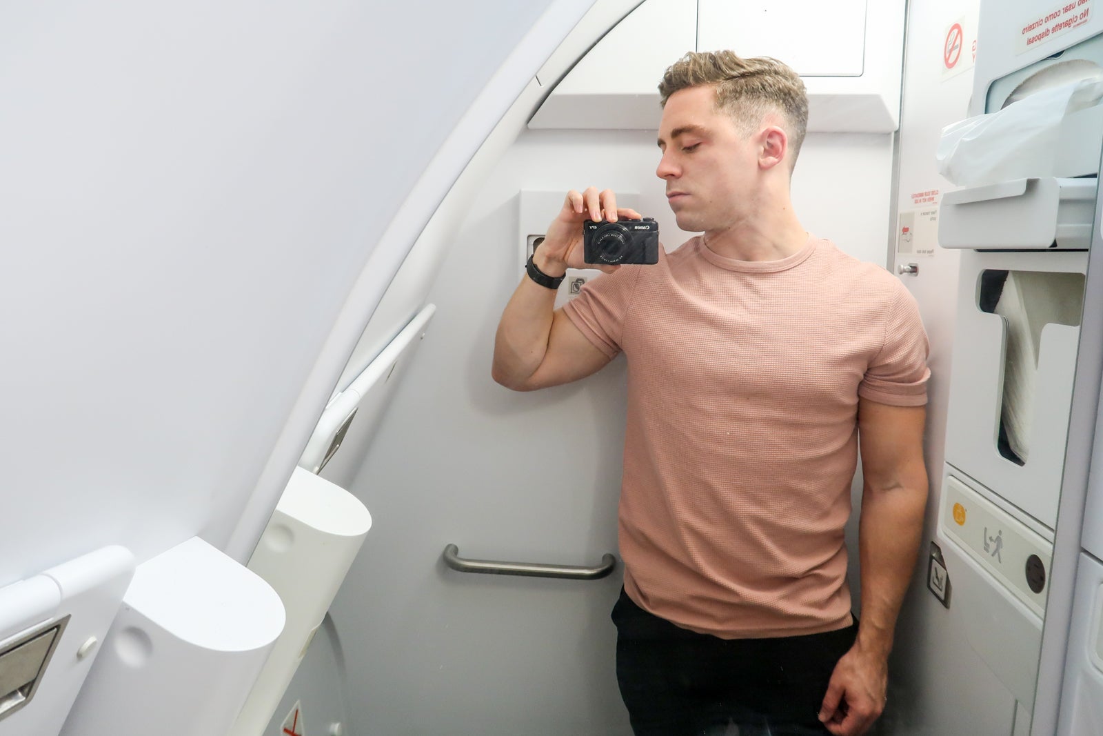 Due to the narrowness of the plane, the bathroom was almost cut in half diagonally by the wall of the fuselage. It was definitely not the most comfortable of spaces.
