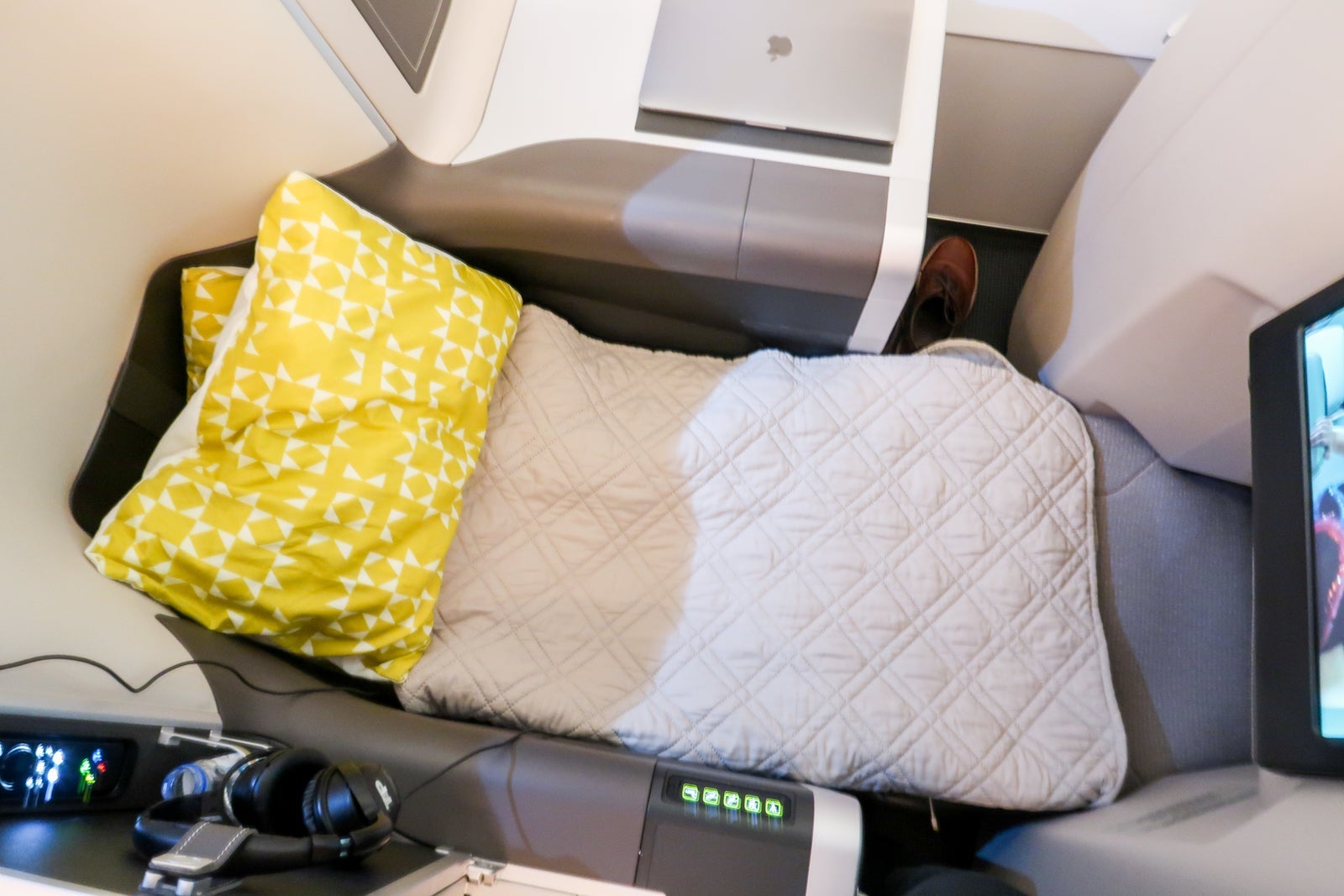 The seat lowered nice and easy into a fully flat bed. The blanket was basic, but I liked the thickness and quality of the pillows. So much so that I asked for a second, which was brought to me with no problem.