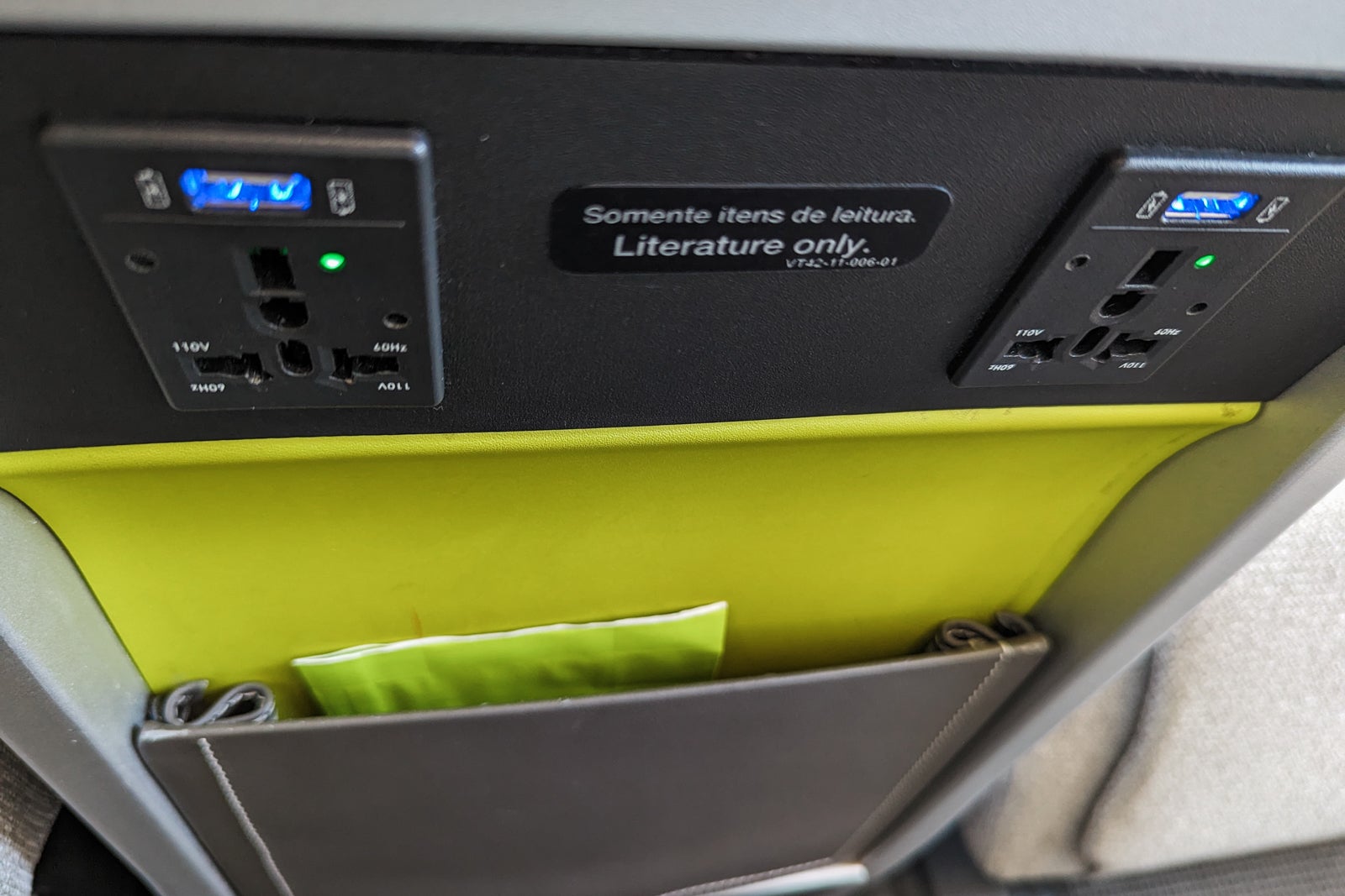 Power outlets are in the seat divider/armrest facing the seat in front of you, so you have to contort your body to see where they are to insert your power cord. (My cellphone flashlight came in handy here.)