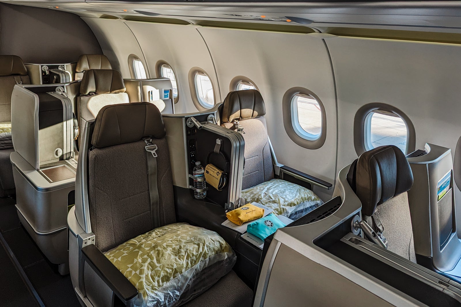 Business class doesn't really have a bad row, though Row 1 by the galley and bathroom might be more trafficked and noisy, depending on your flight crew and fellow passengers. However, after trying out both seat types, I understand why those throne seats get snapped up quickly. It's not just the privacy — they offer much more space for stowing your things.