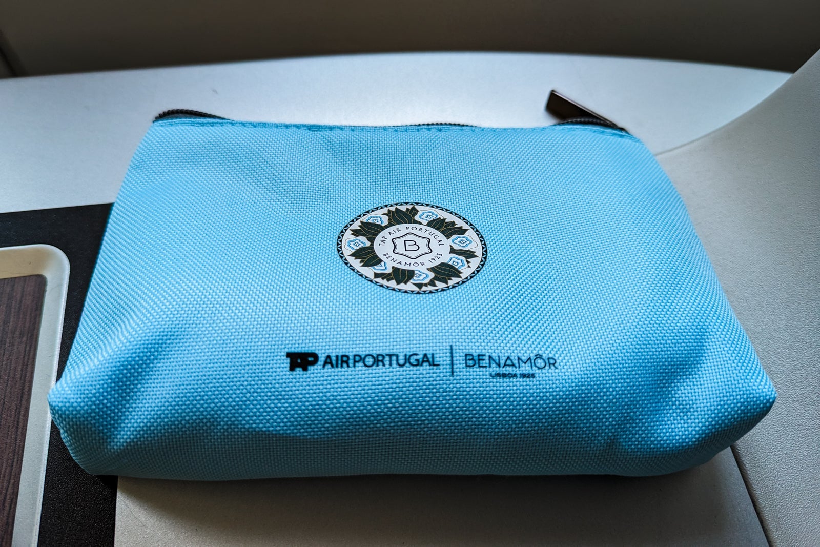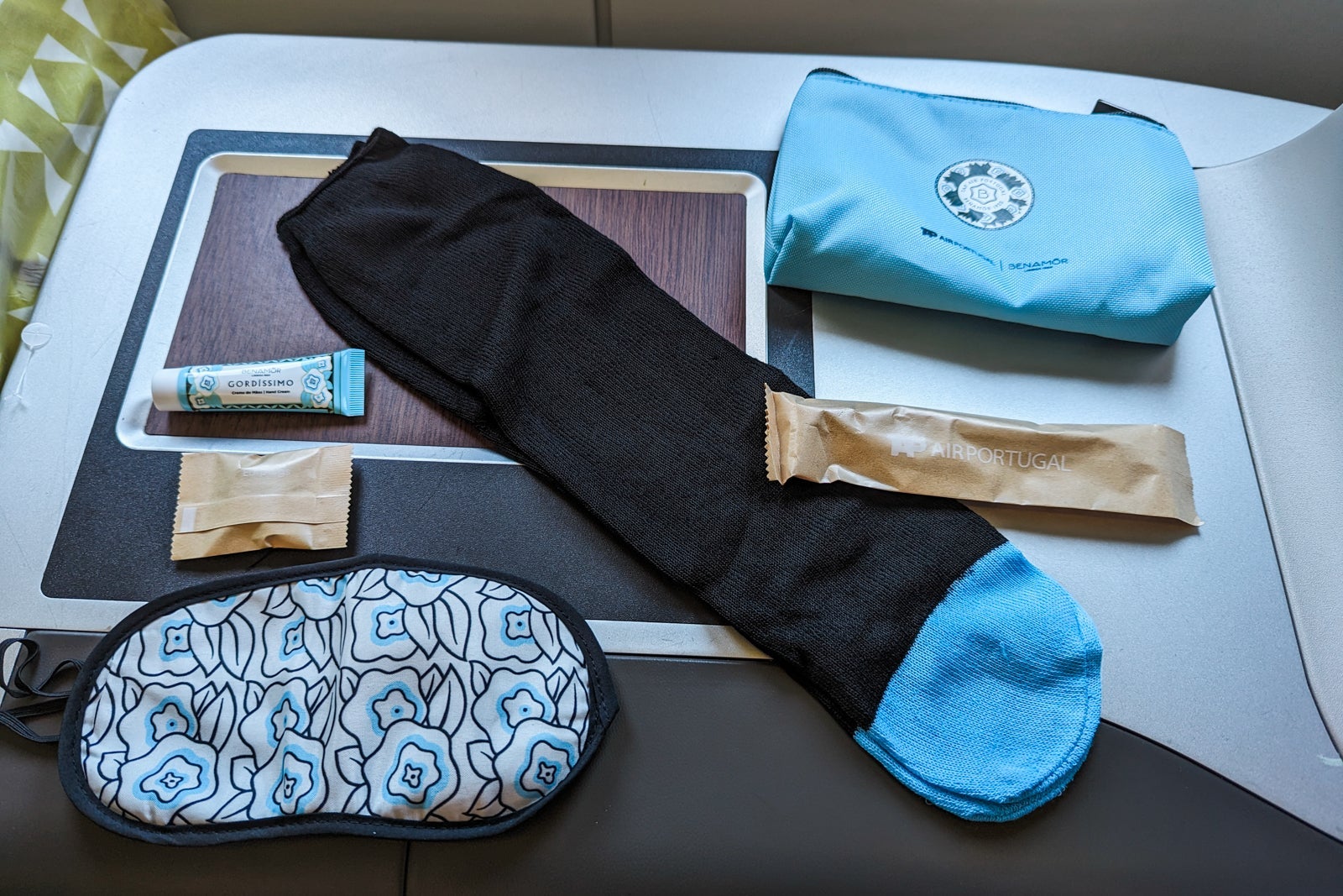 TAP provides an amenity kit by Portuguese brand Benamor in a bag made from recycled plastics. The kit has the basics with no frills: an eye mask with a cute floral design, one-size-fits-all socks, a wooden toothbrush, a tiny tube of toothpaste, earplugs and Benamor hand cream. There was no lip balm or moisturizer.