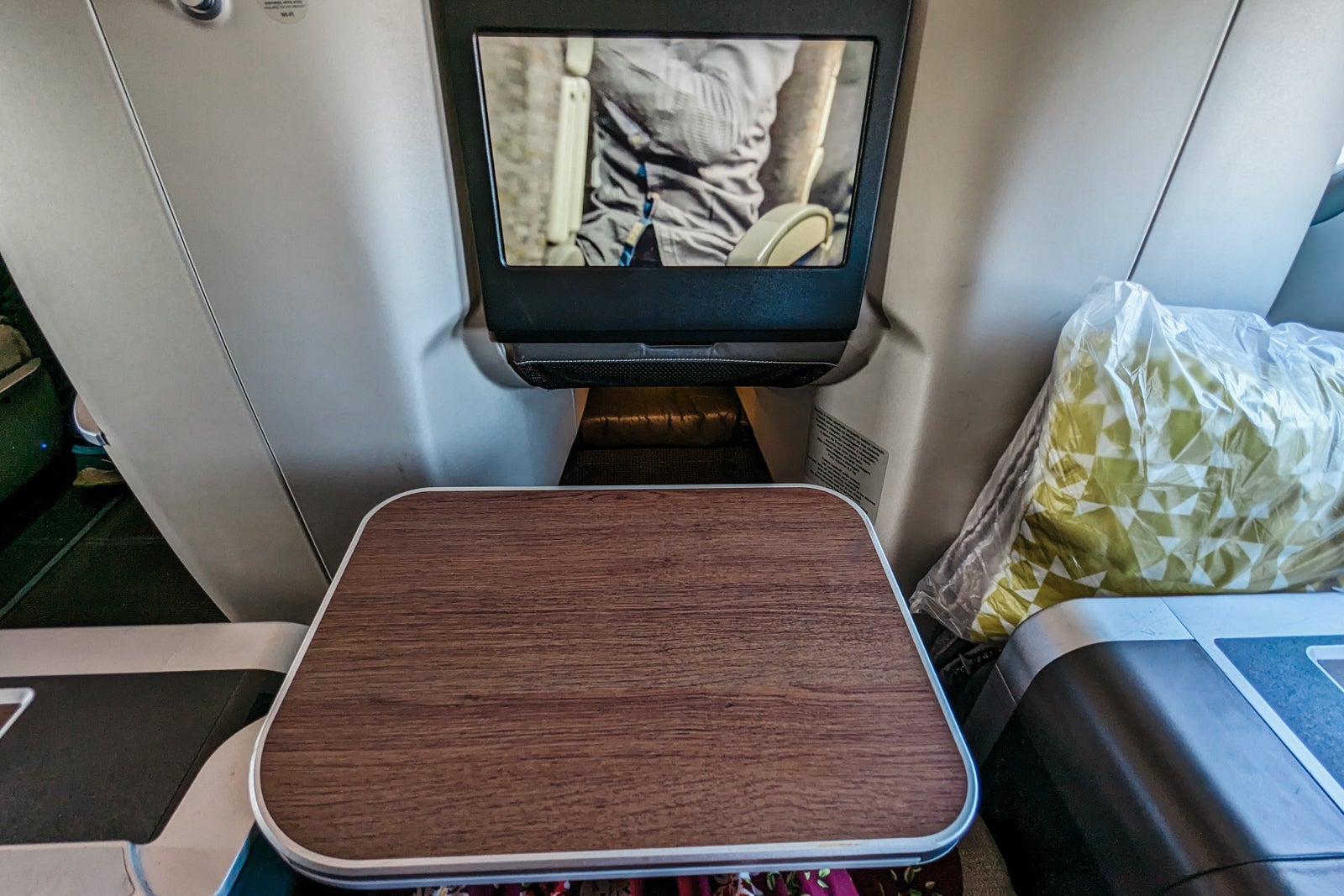 With a seat pitch of 44 inches, I found I had to lean forward to use the touchscreen options on the TV. Presumably, the remote was supposed to help you with that, but it was tricky to release and return it to its rest, and I found the controls finicky. The touchscreen was easier but impossible to use with the tray table deployed.