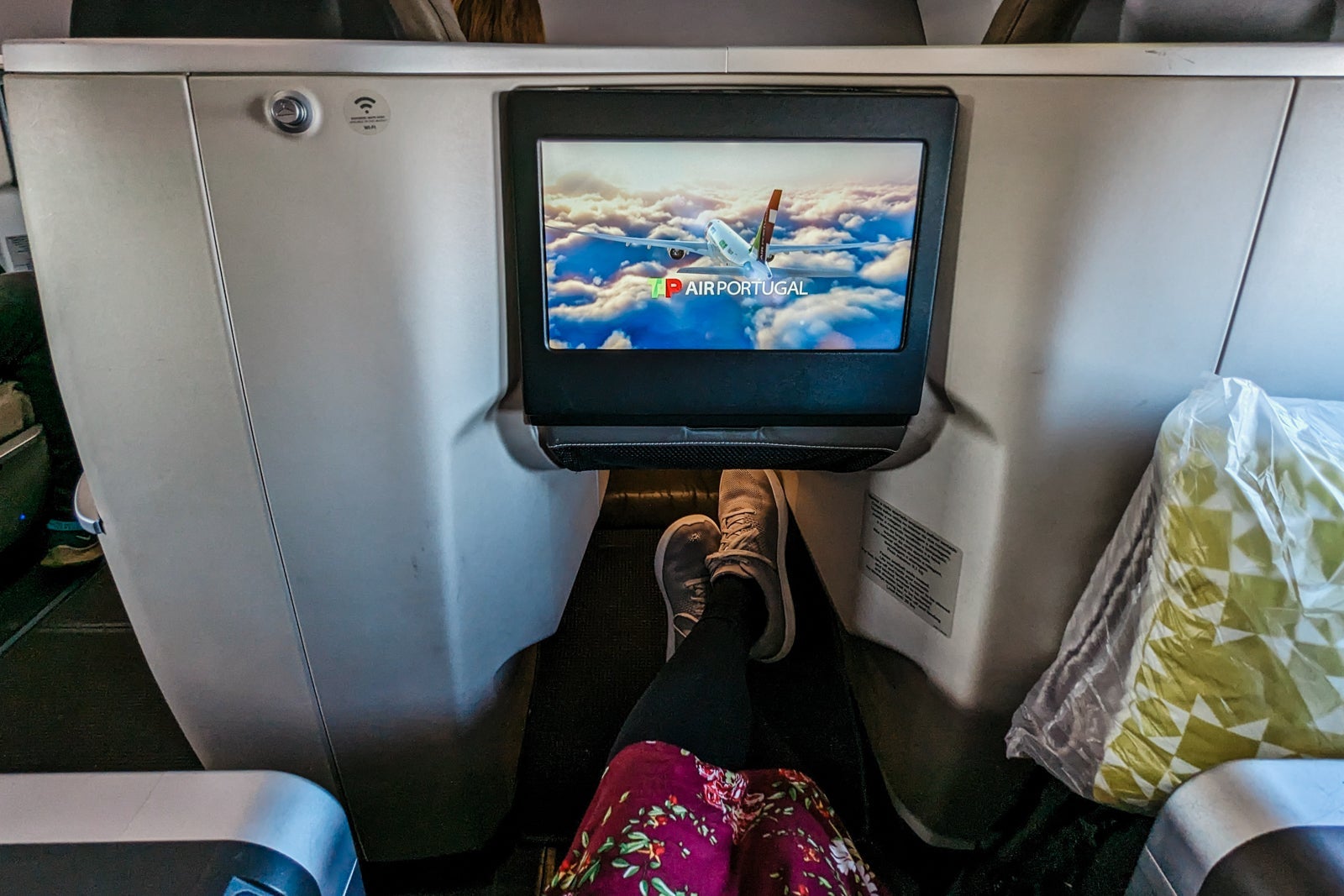 It worked out that I had the throne seat on the overnight flight and the two-seater on the day flight. I was mostly happy with the TAP business-class seats in the upright position. I had elbow room on each side (though much more in the throne) and tons of space for my feet and legs. The slight recline position with my feet a bit elevated was comfy for watching TV. The tray table was wide enough to support a full meal tray or my laptop with space to spare.