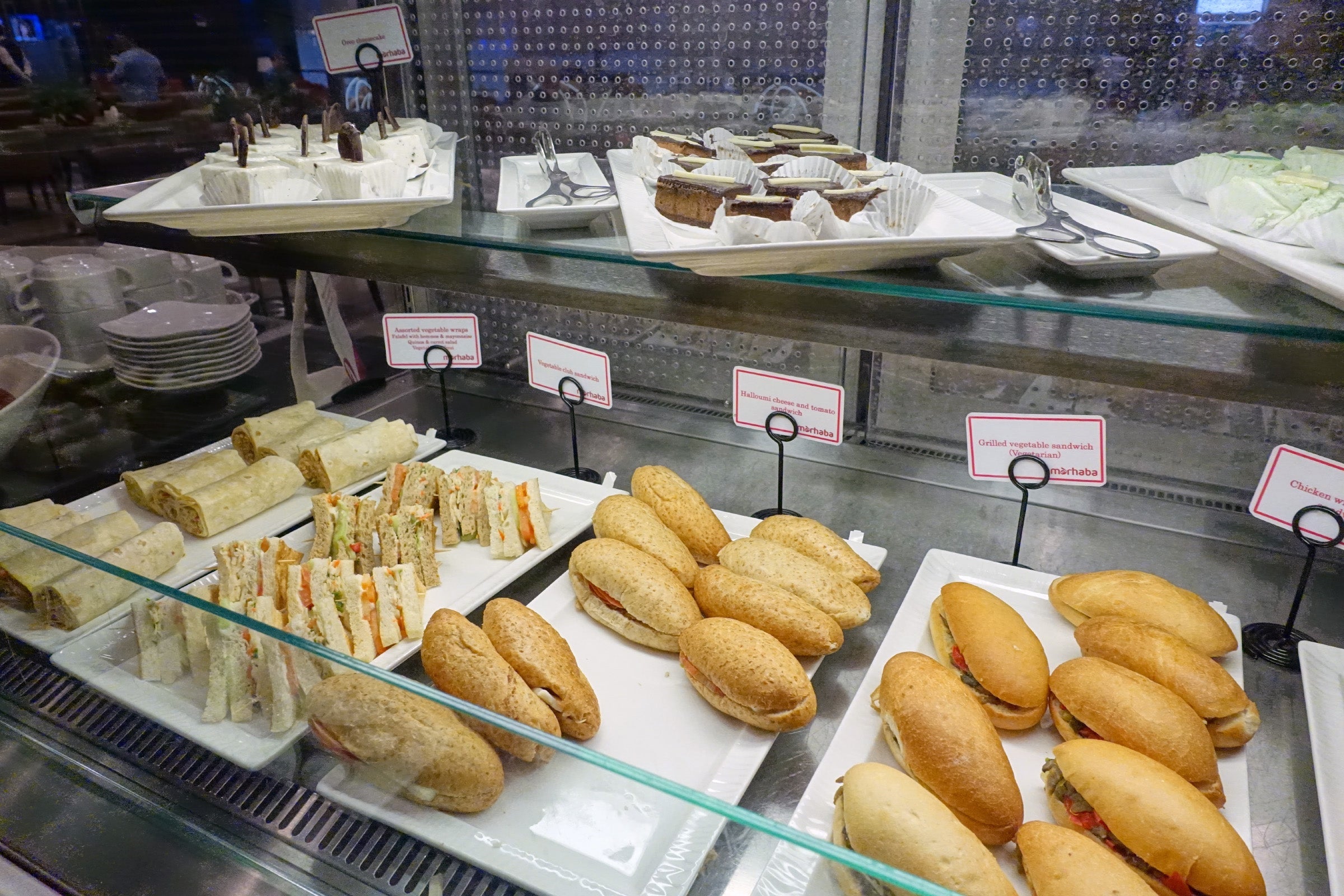 In addition to salads and hummus, there were sandwiches and hot breakfast items like eggs and chicken sausage.