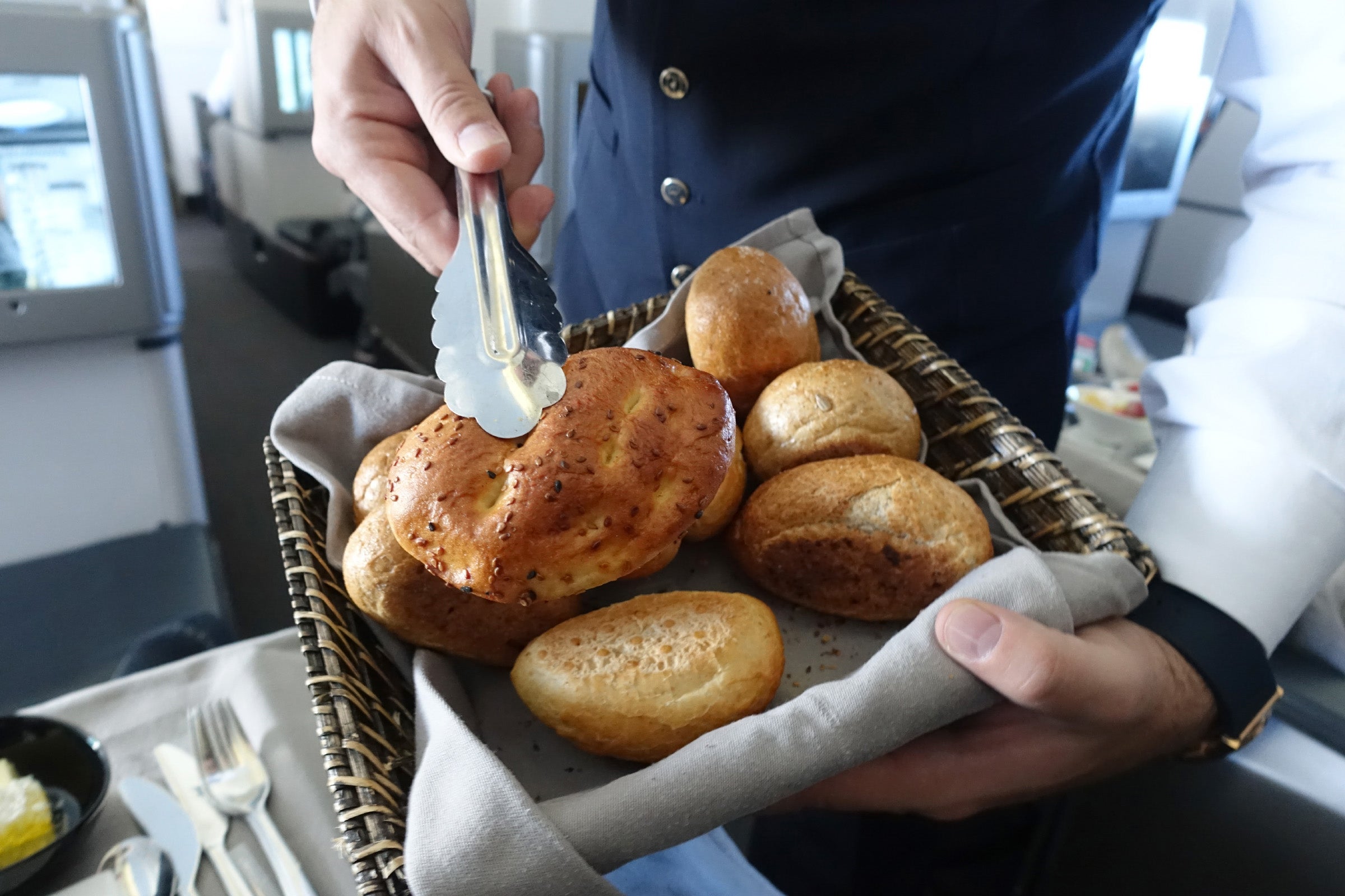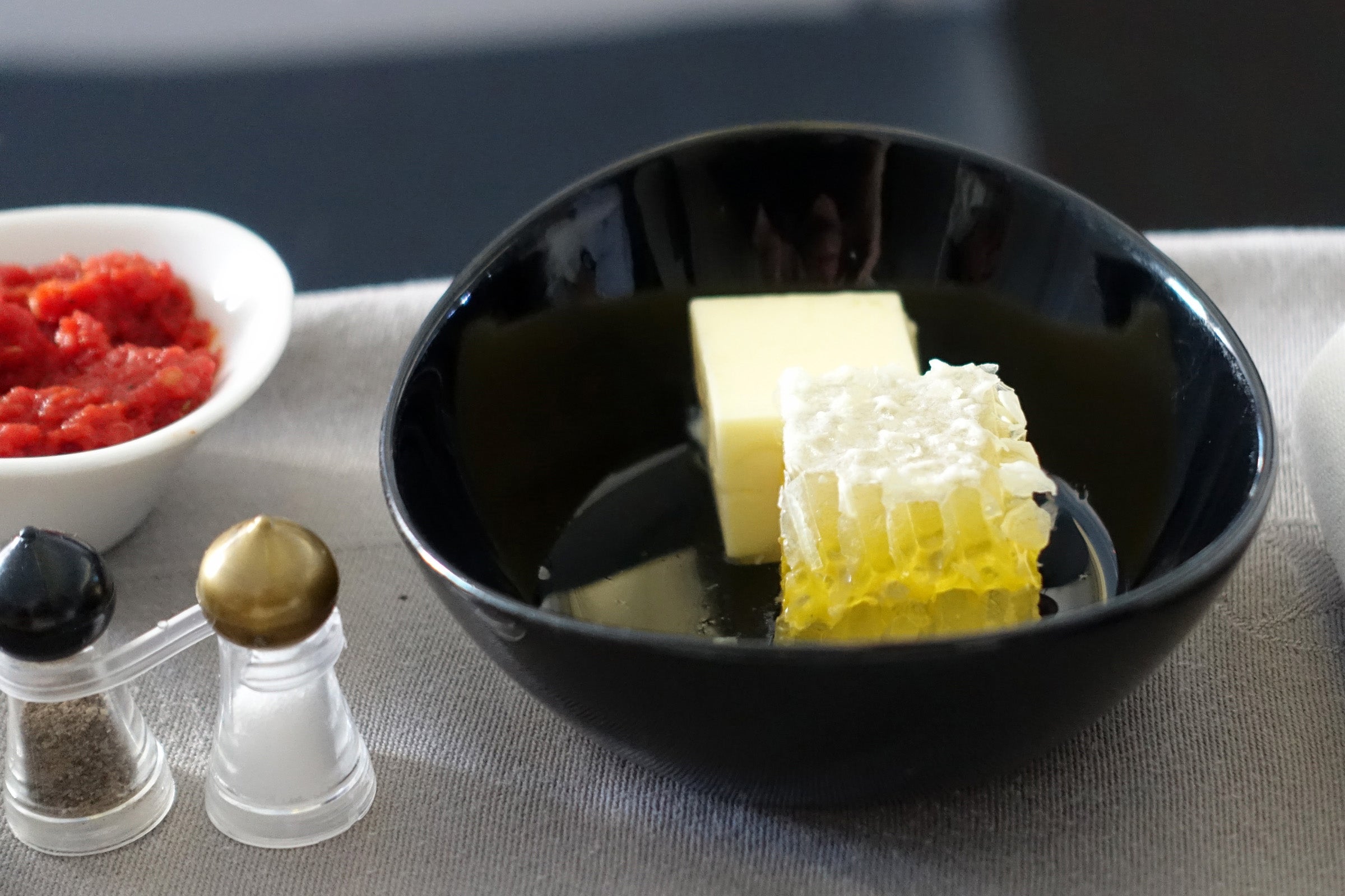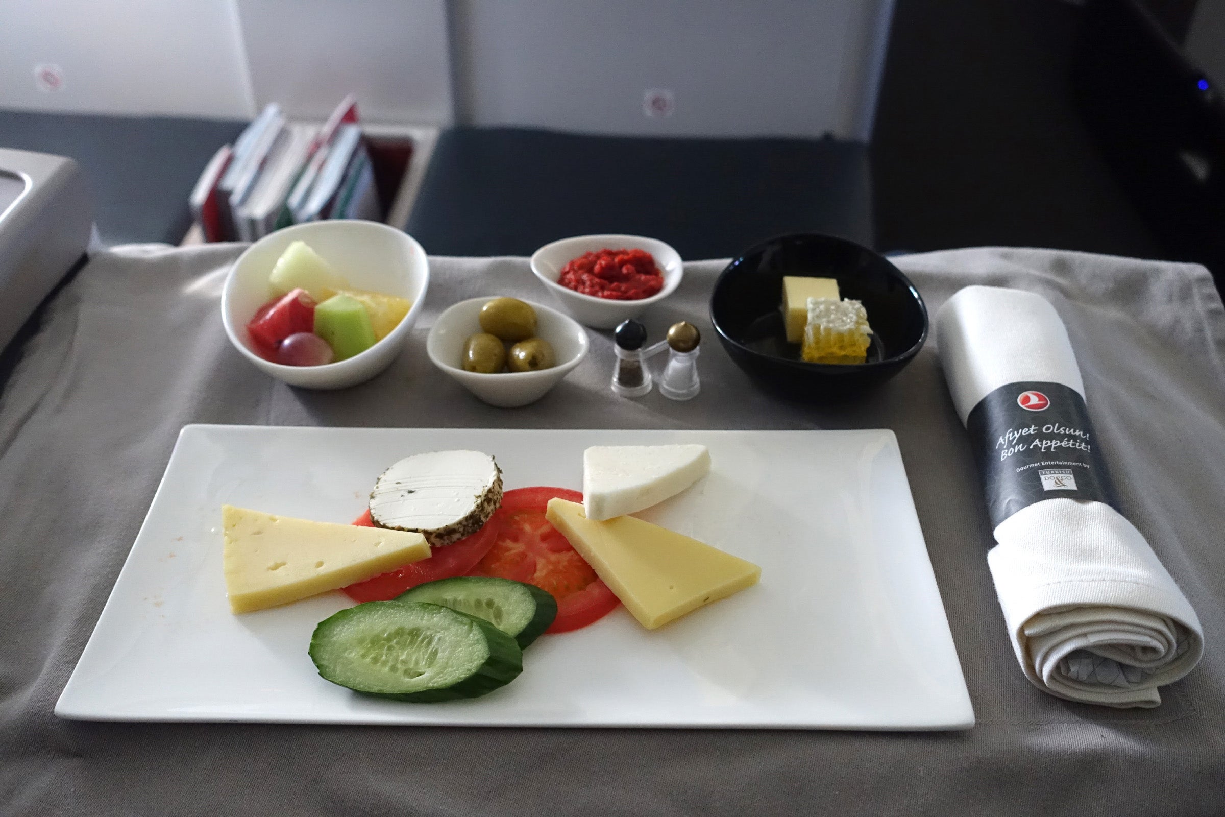 Since this was a morning flight, breakfast was served. It was still a multi-course affair, though — first up was a small vegetable-and-cheese spread, which was served with fresh fruit, olives, honeycomb and butter.