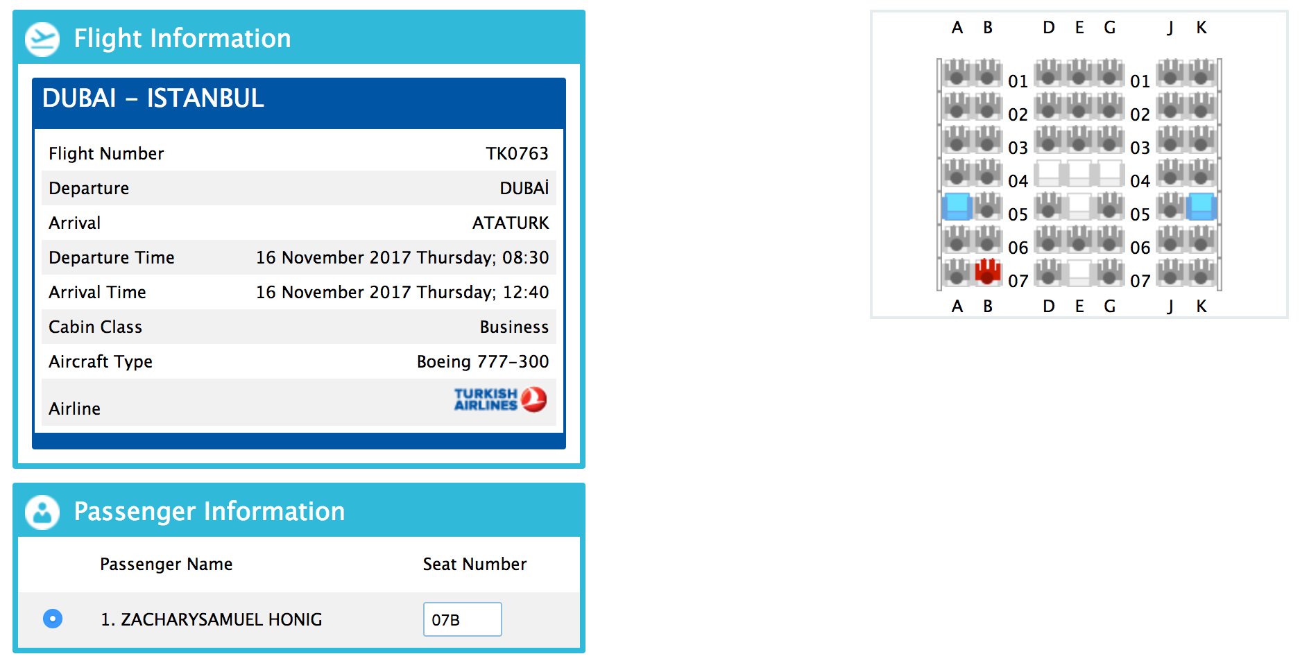 Once Amex issued my ticket, I was able to head over to Turkish's site to select my seats. There weren't many left to choose from even several weeks before departure, but I settled on 7B, an aisle seat in the last row of the business-class cabin.