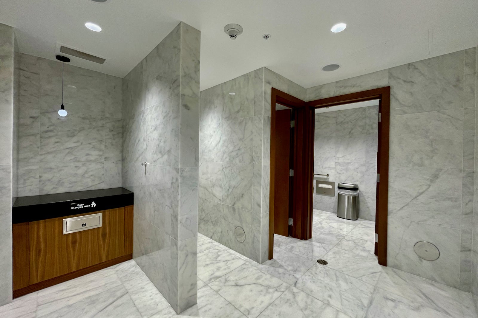 The marble-clad gender-specific restrooms were in immaculate condition throughout my visit.