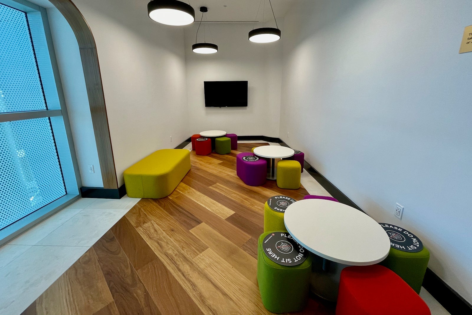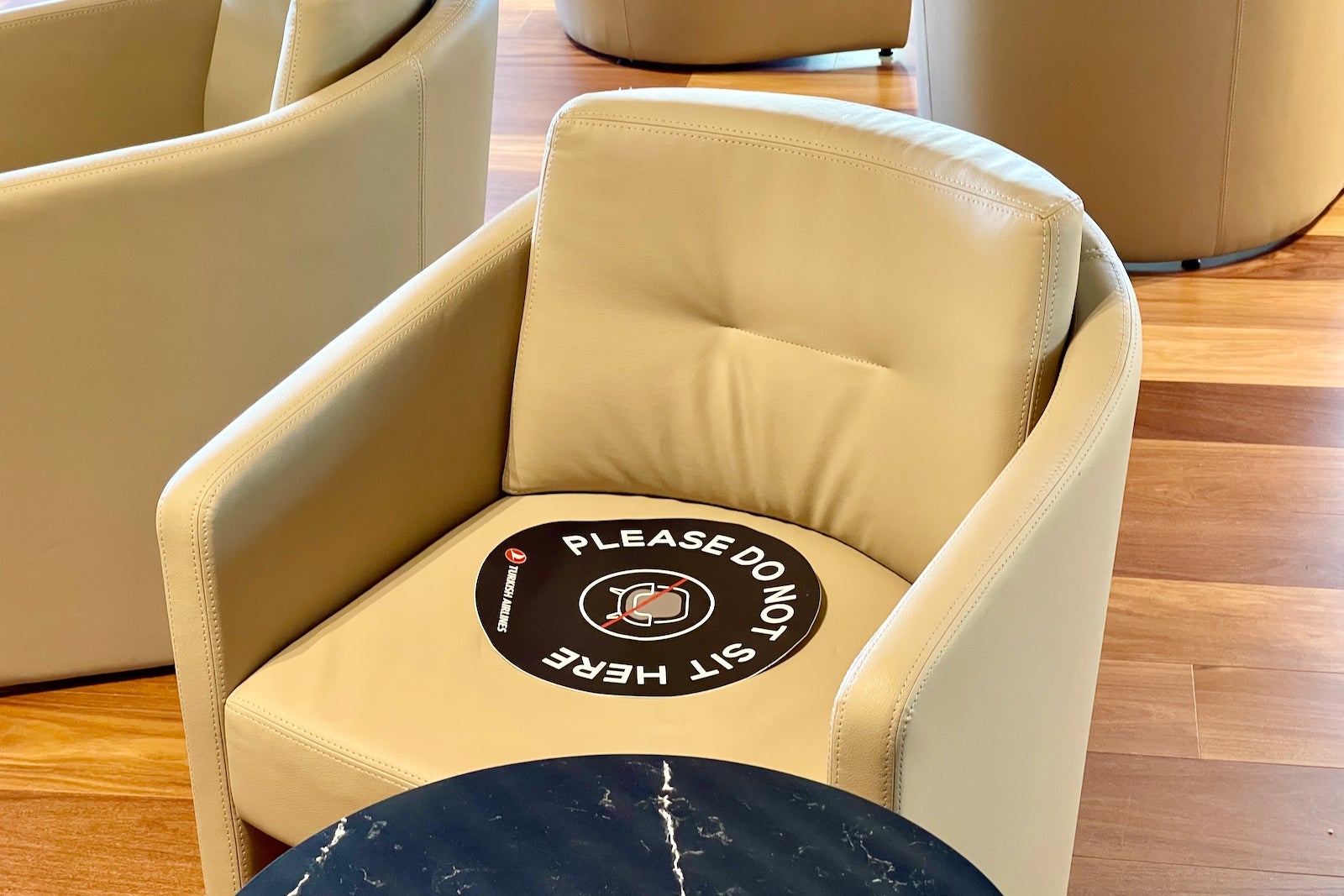 The lounge is capped at 50% capacity due to COVID, and there are decals on the floor and seats demarcating social distancing guidelines.