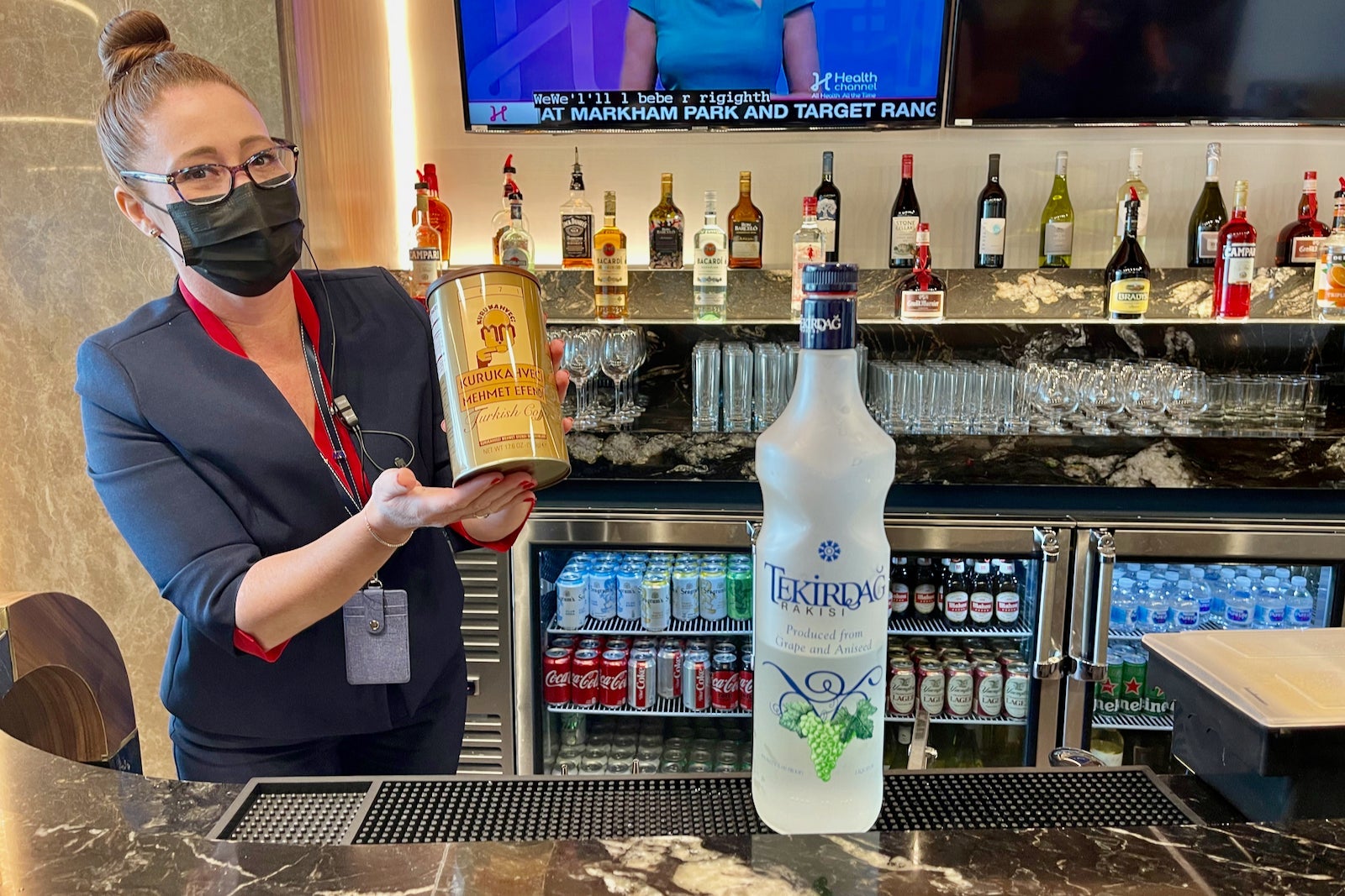 The fully stocked bar offers a range of complimentary spirits, including Turkey's national drink, raki, as well as traditional favorites, like Bacardi rum and Beefeater gin.