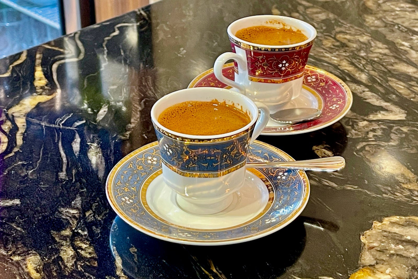 Coca-Cola-branded soft drinks are served in individual cans, and Turkish tea and coffee are available as well.