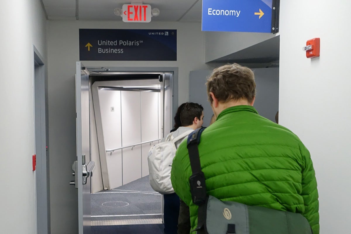 Passengers could board the 777-300ER through two jet bridges — the one on the left brought you through door #1 (at the front of the plane), while one on the right was attached to door #2 (at the beginning of the second Polaris cabin).