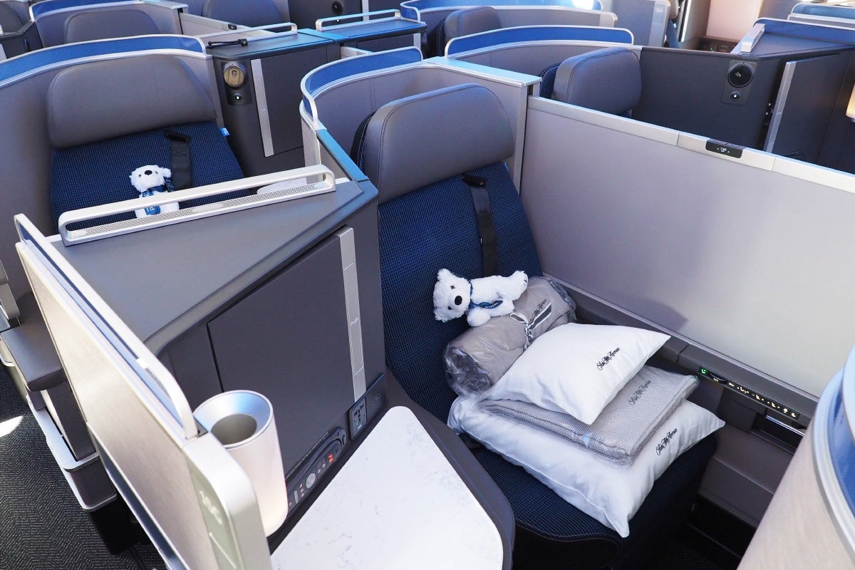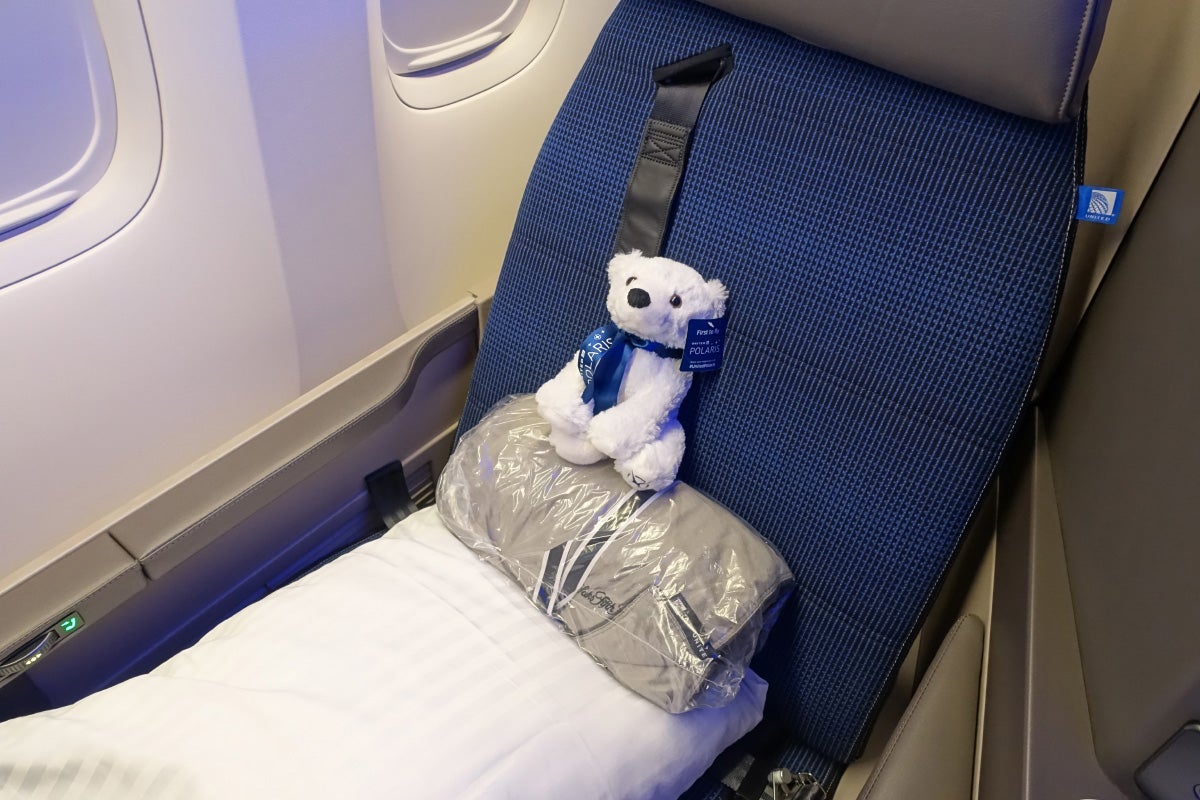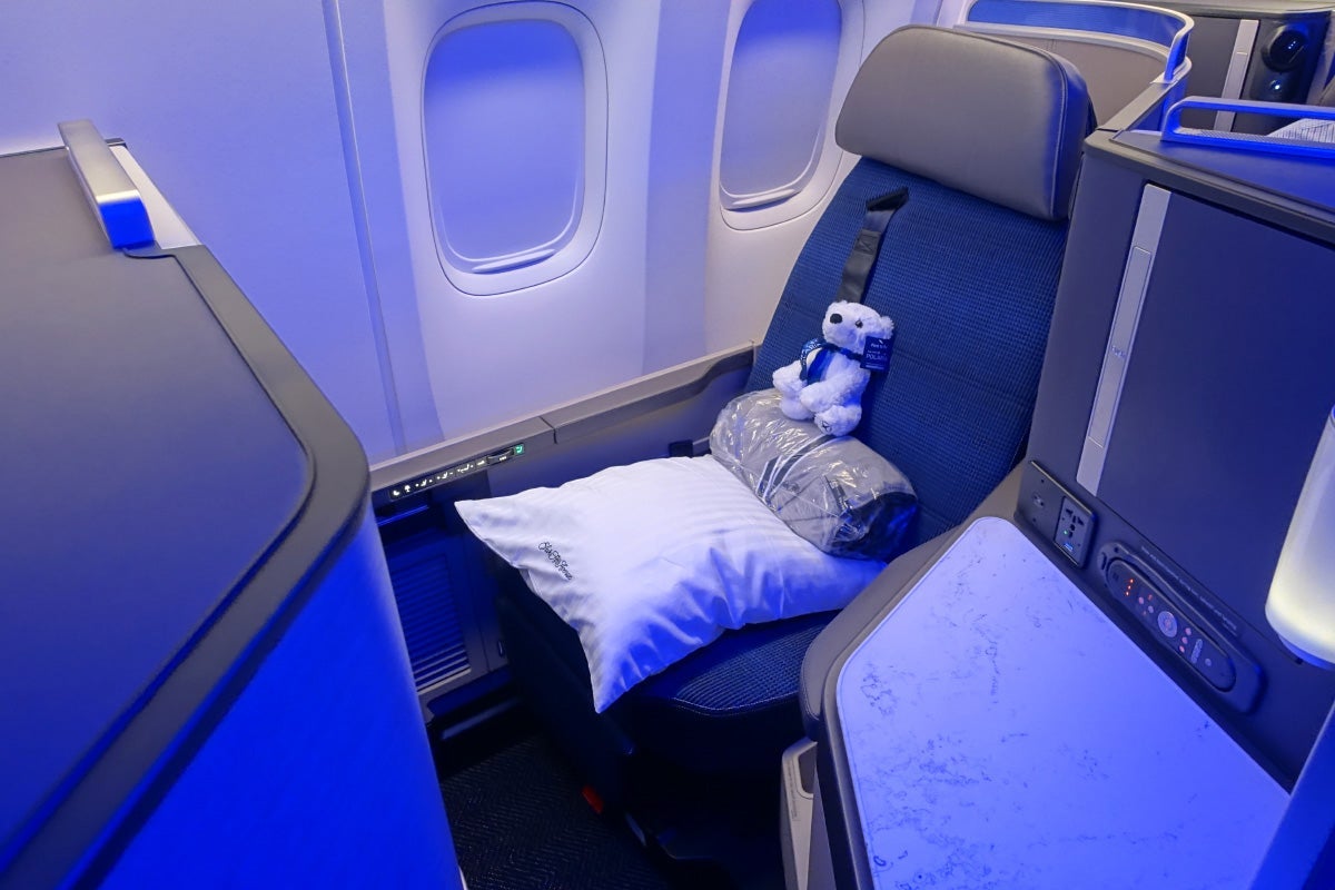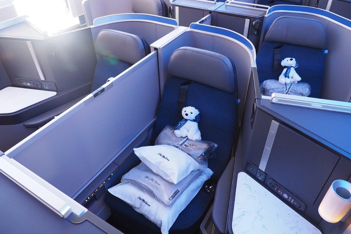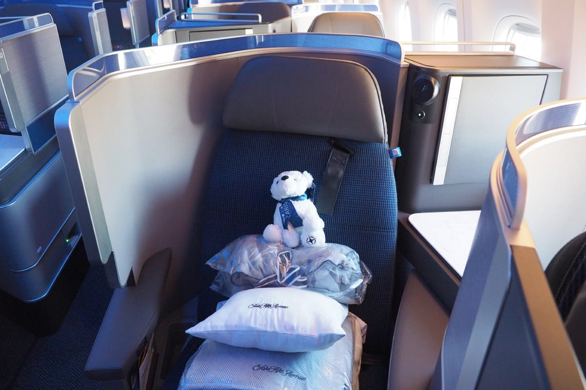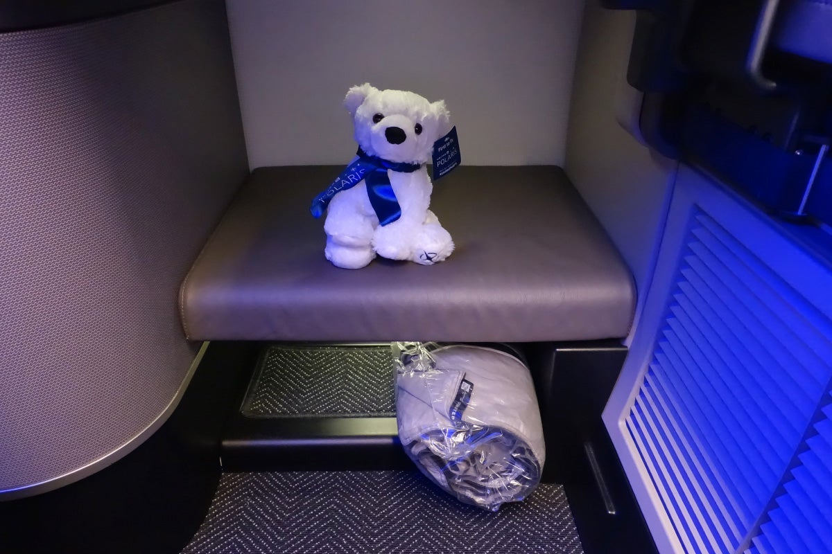 United's p.s. flights don't offer Polaris service, so you don't get all the bedding and amenities available on international routes. However, these flights (even on the 757s) do include large Saks Fifth Avenue pillows and blankets. And, for this inaugural flight, each passenger got a Polaris teddy bear as well.