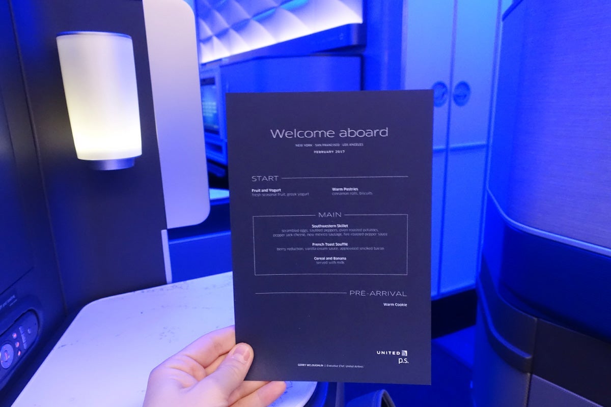 I wasn't quite sure what to expect for this flight on the food and beverage front — sure, it didn't seem likely that we'd experience the same level of service as we had on Monday's preview flight, but this would have been a good opportunity to highlight some of the higher-end dishes on United's most premium domestic route. Instead, it was just the regular p.s. service, served on a tray with three entree choices. All of the flight attendants I interacted with were really friendly, though (and excited for their first flight on the 77W).
