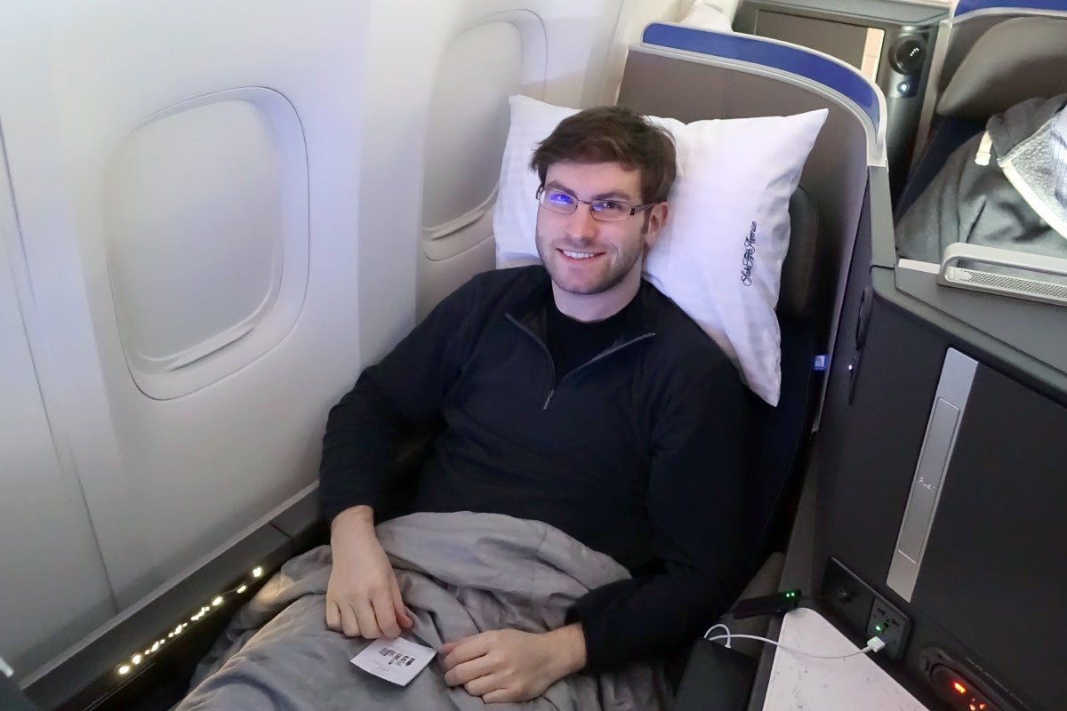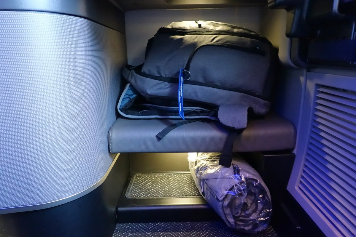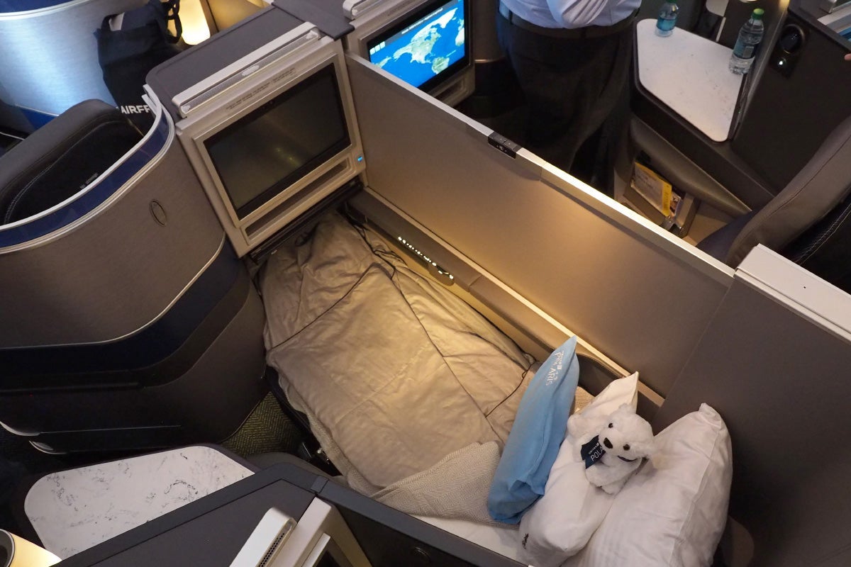 Of course, these seats go completely flat, and if you happen to catch the 77W on an international flight, you'll have a full suite of bedding to choose from, including a mattress cover and gel pillow (pictured below).