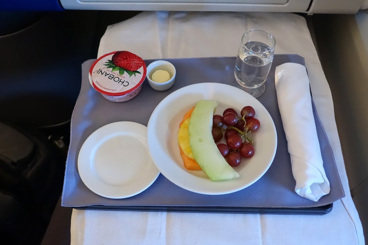 Then, maybe 30 minutes after takeoff, flight attendants came through with the "appetizer" breakfast tray, which consisted of Chobani yogurt and fresh fruit.