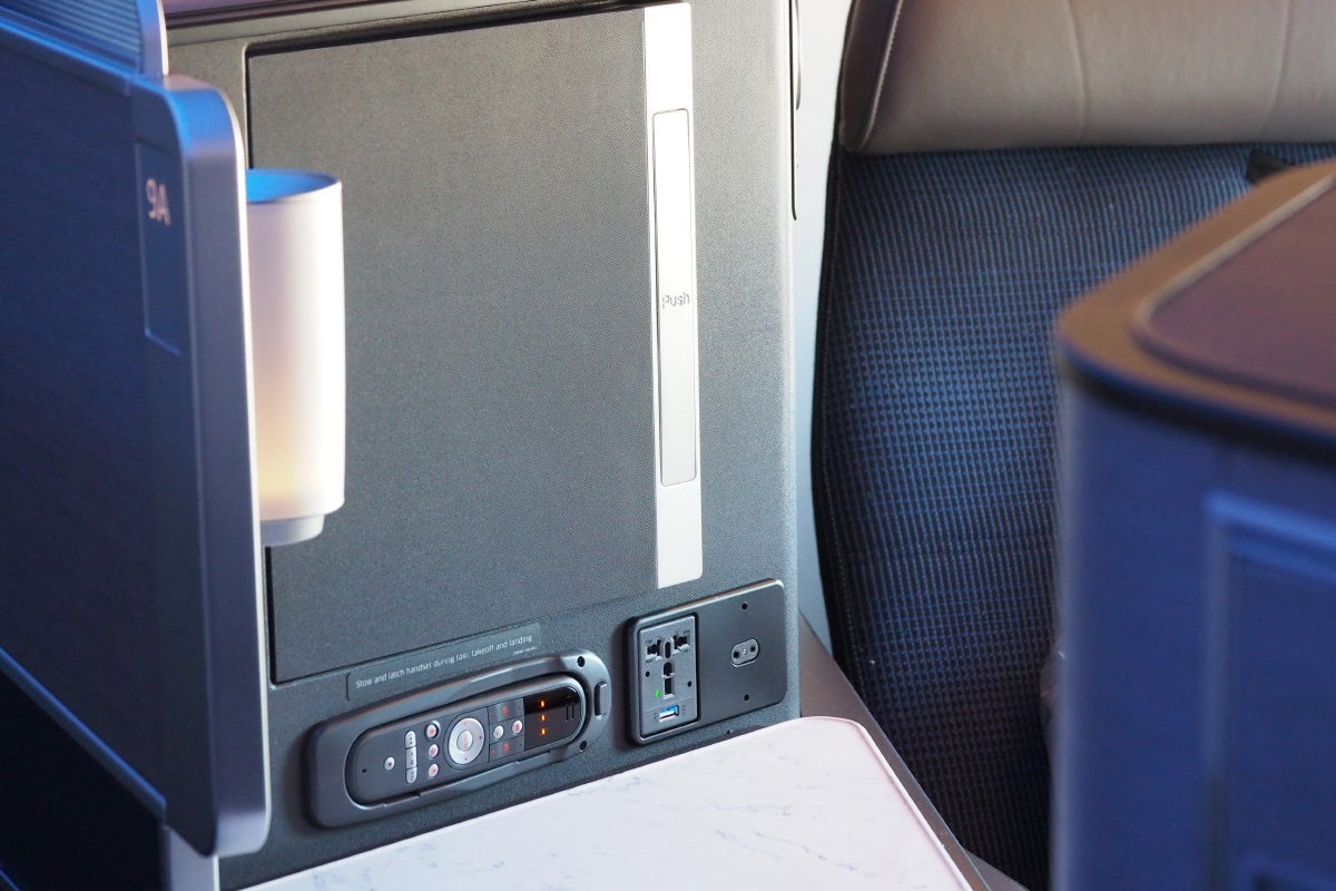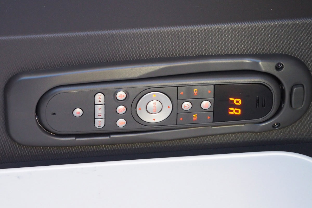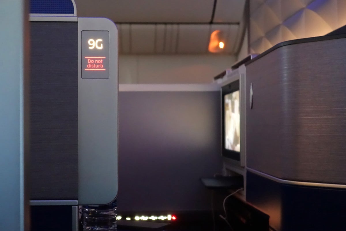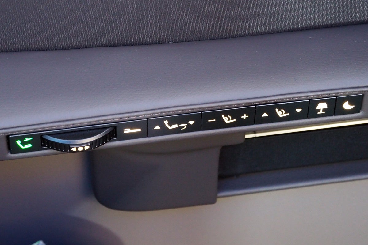 These seats also have a unique (and supremely intuitive) recline wheel. To put your seat in lie-flat mode, simply turn the wheel to the right; rotating it in the opposite direction will return the seat to its upright position. Other buttons make it possible to make some granular adjustments as well — one switch lets you turn the light fixture on or off, while the one on the far right (below) activates the Do Not Disturb sign.