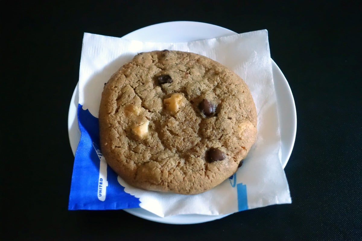 Then, about 90 minutes before landing, we had warm chocolate and vanilla chip cookies. Yum!
