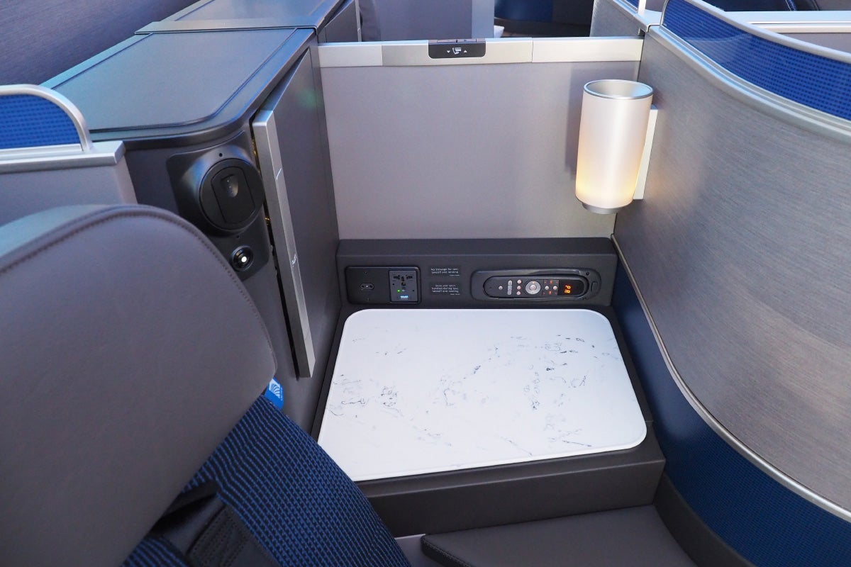 Center seats in even-numbered rows also offer a partition, though it doesn't need to be nearly as wide, given the position of the seats. Every seat has a large fixed table — while it looks like granite, it's actually a composite material, since a large piece of stone would be too heavy to install on an aircraft. The table is designed to match the ones that are available in the Polaris Lounge.