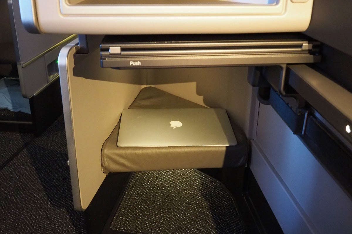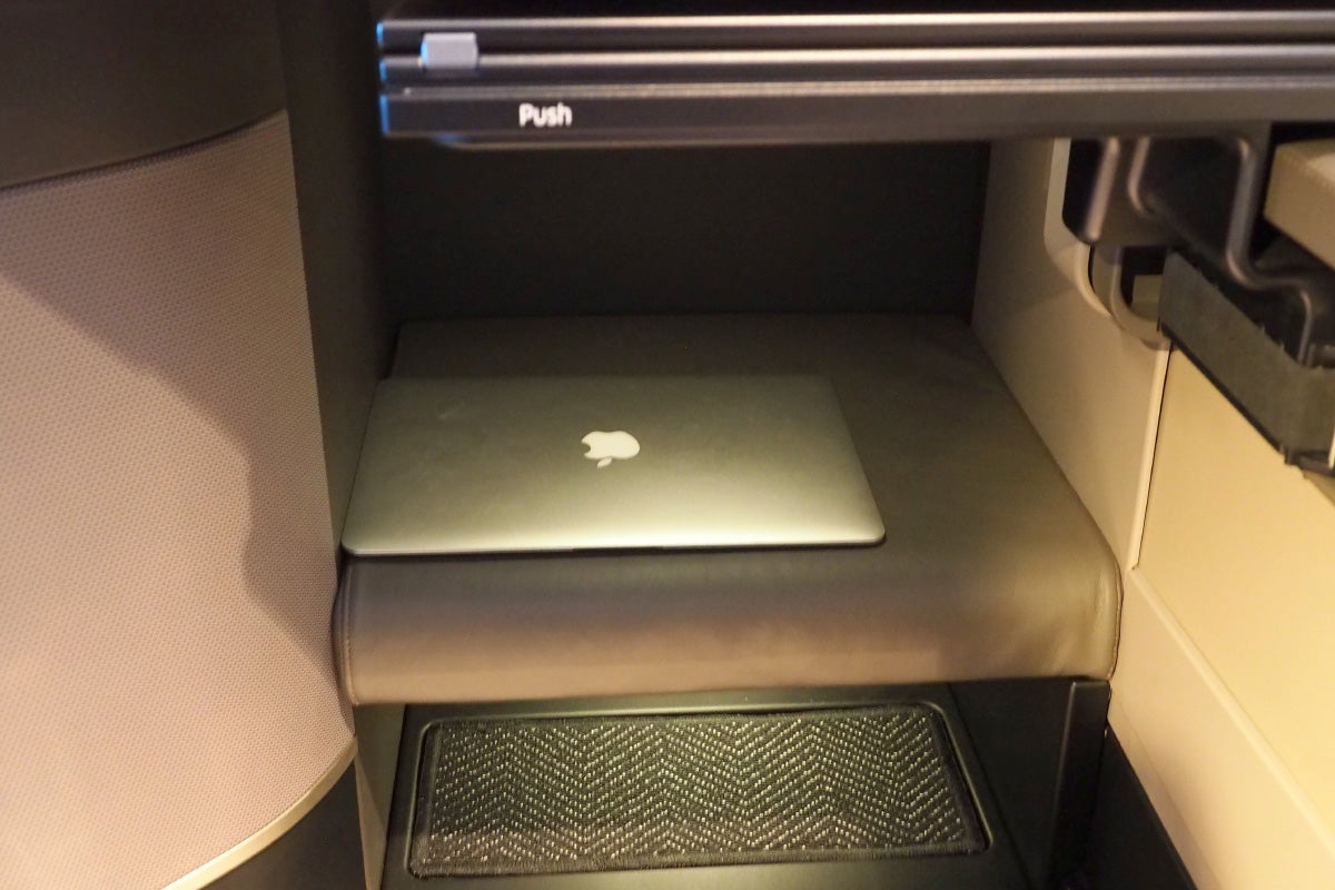 Again, one thing to keep an eye out for is the footwells. They're by no means tiny at any of the seats, but some definitely offer more space than others. For example, here's a 13-inch MacBook Air in a non-bulkhead footwell: