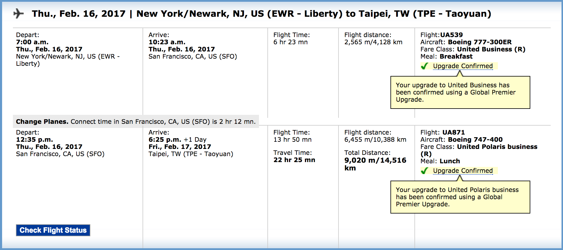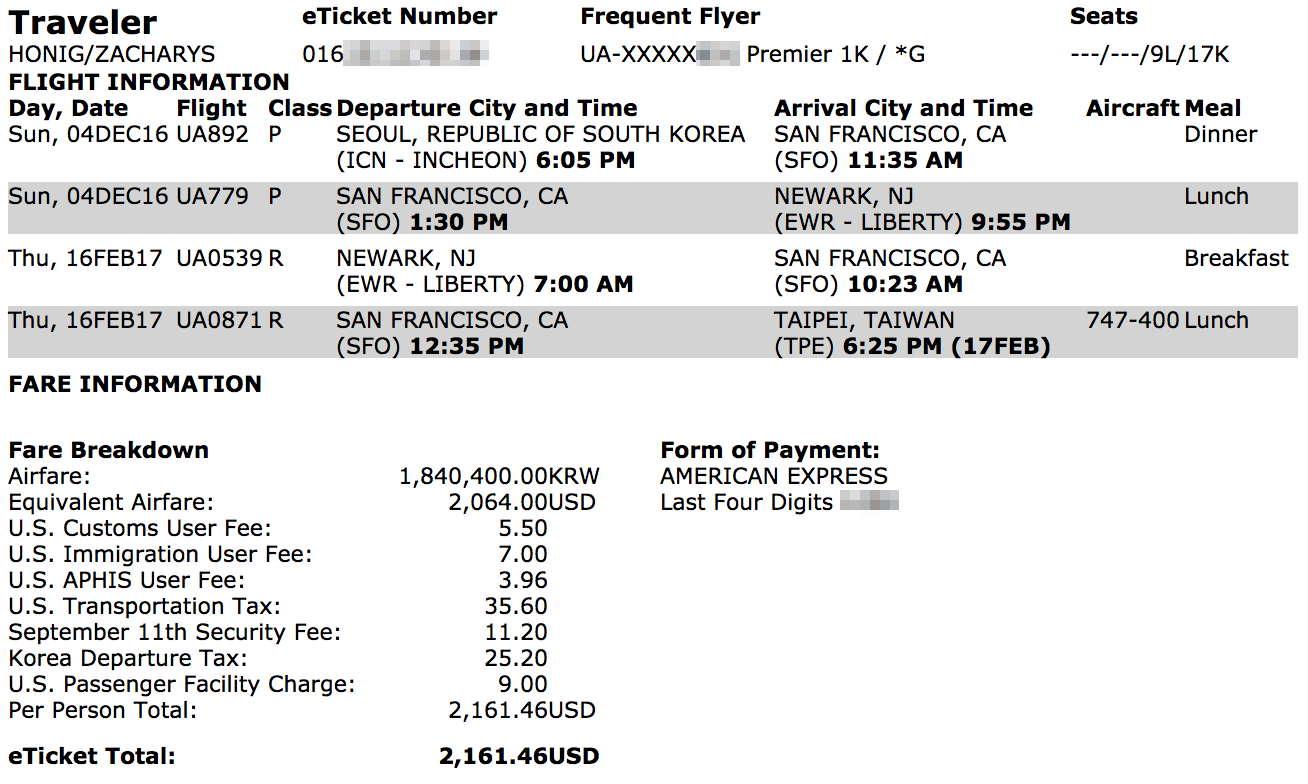 Since this ticket was originating in Seoul, the fare was quite reasonable as well — $2,064 round-trip, including the outbound segments in paid business class and the return booked in "W," then upgraded to business with a Global Premier Upgrade.
