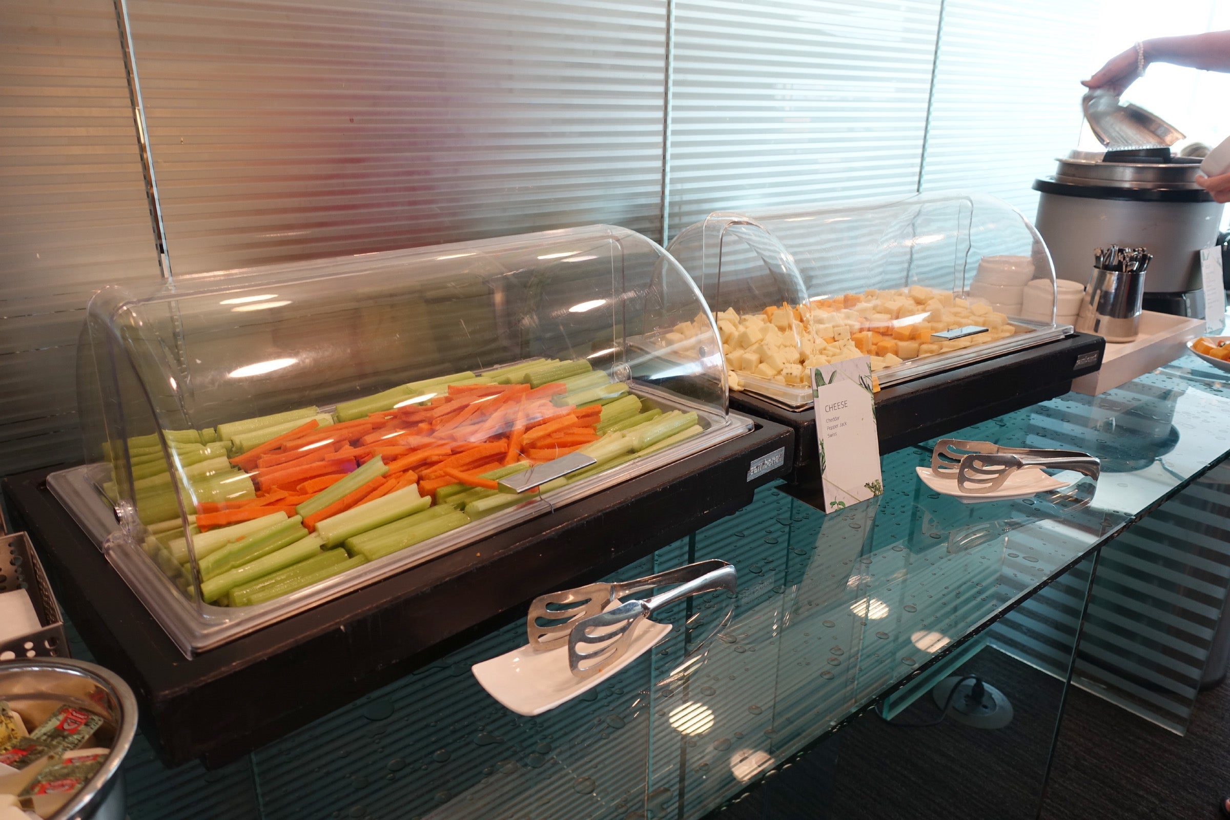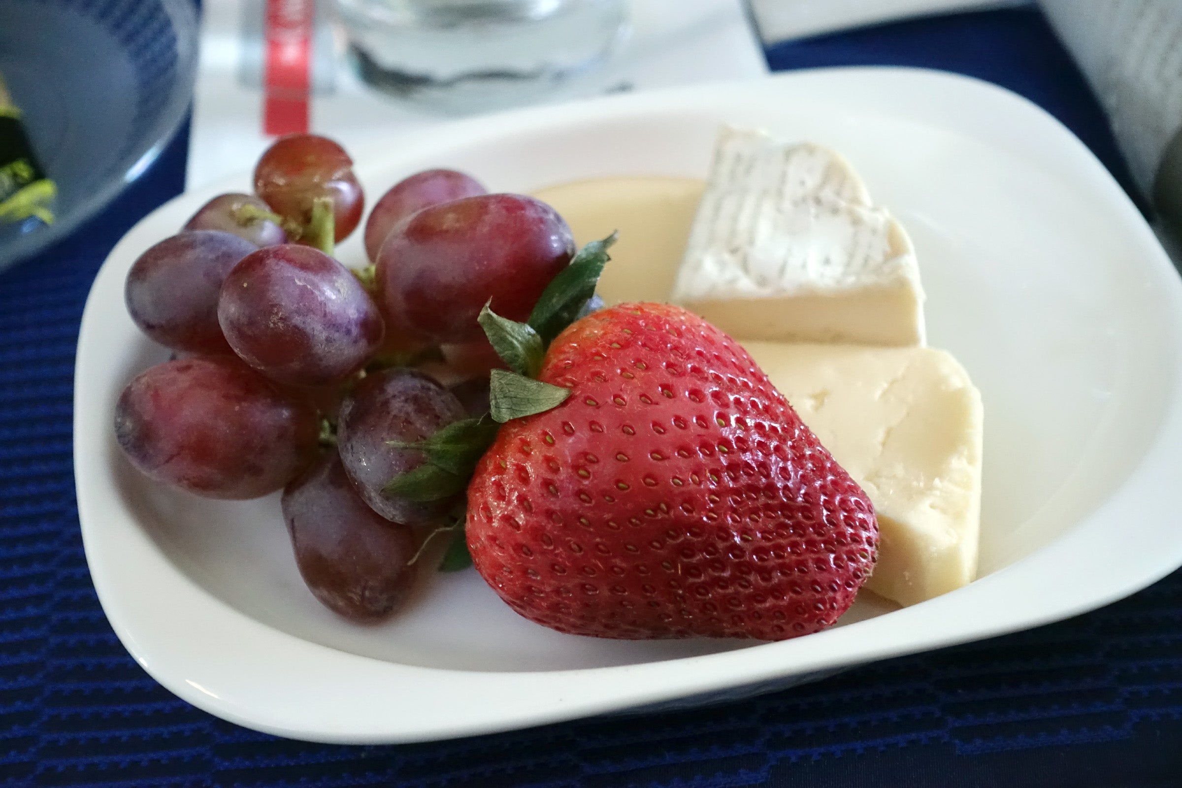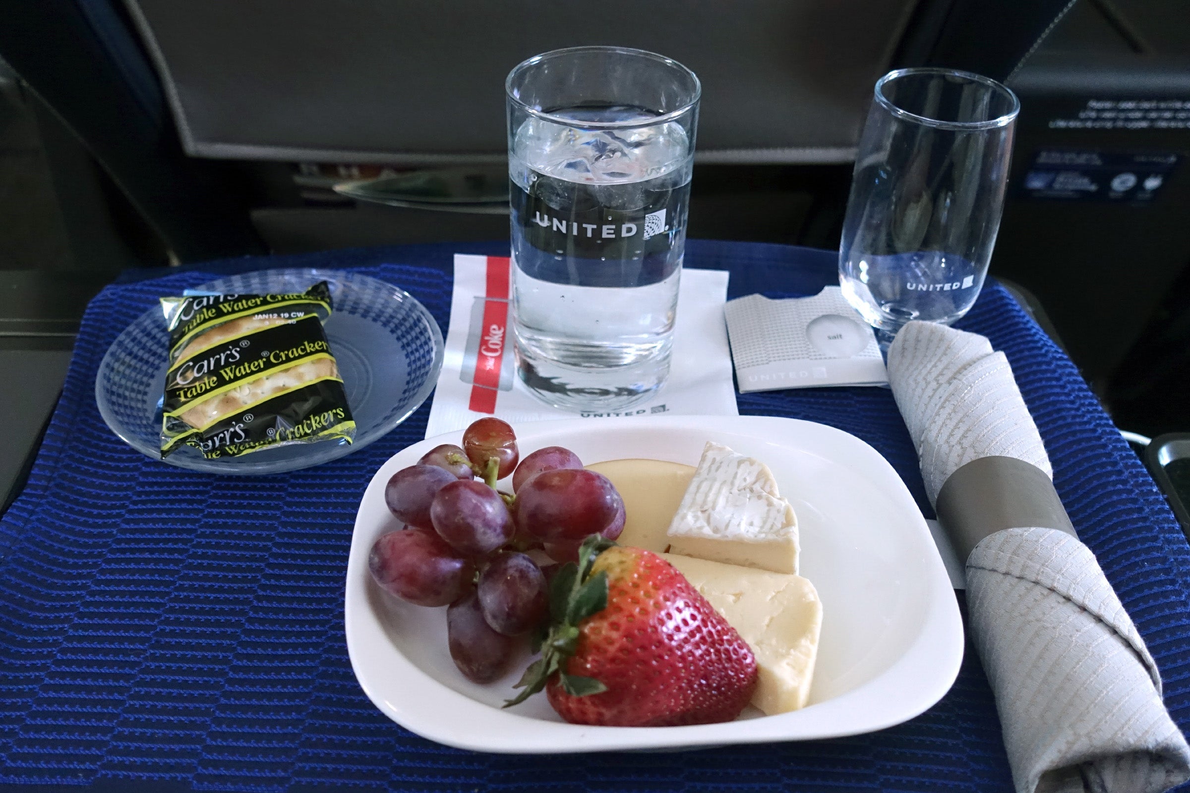 After takeoff, a trainee came by to offer a snack — I had heard her offering a choice of cheese plate or vegetable wrap, but she only mentioned the wrap to me. When I asked about the cheese plate, she initially said "we only have a wrap," and didn't acknowledge that the cheese plates had already been claimed, but when I pointed out that meals are usually distributed according to status she said I could have a cheese plate after all.