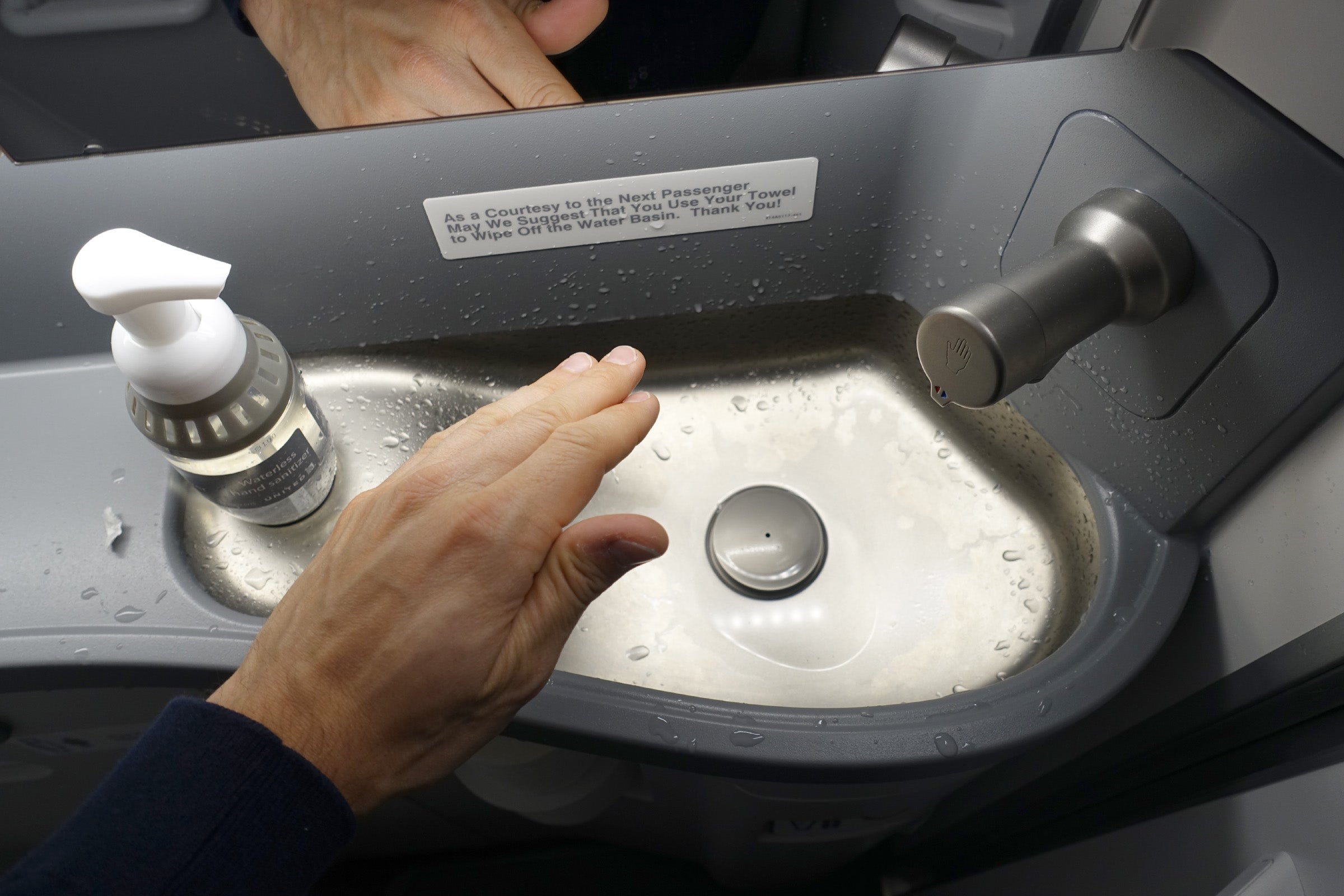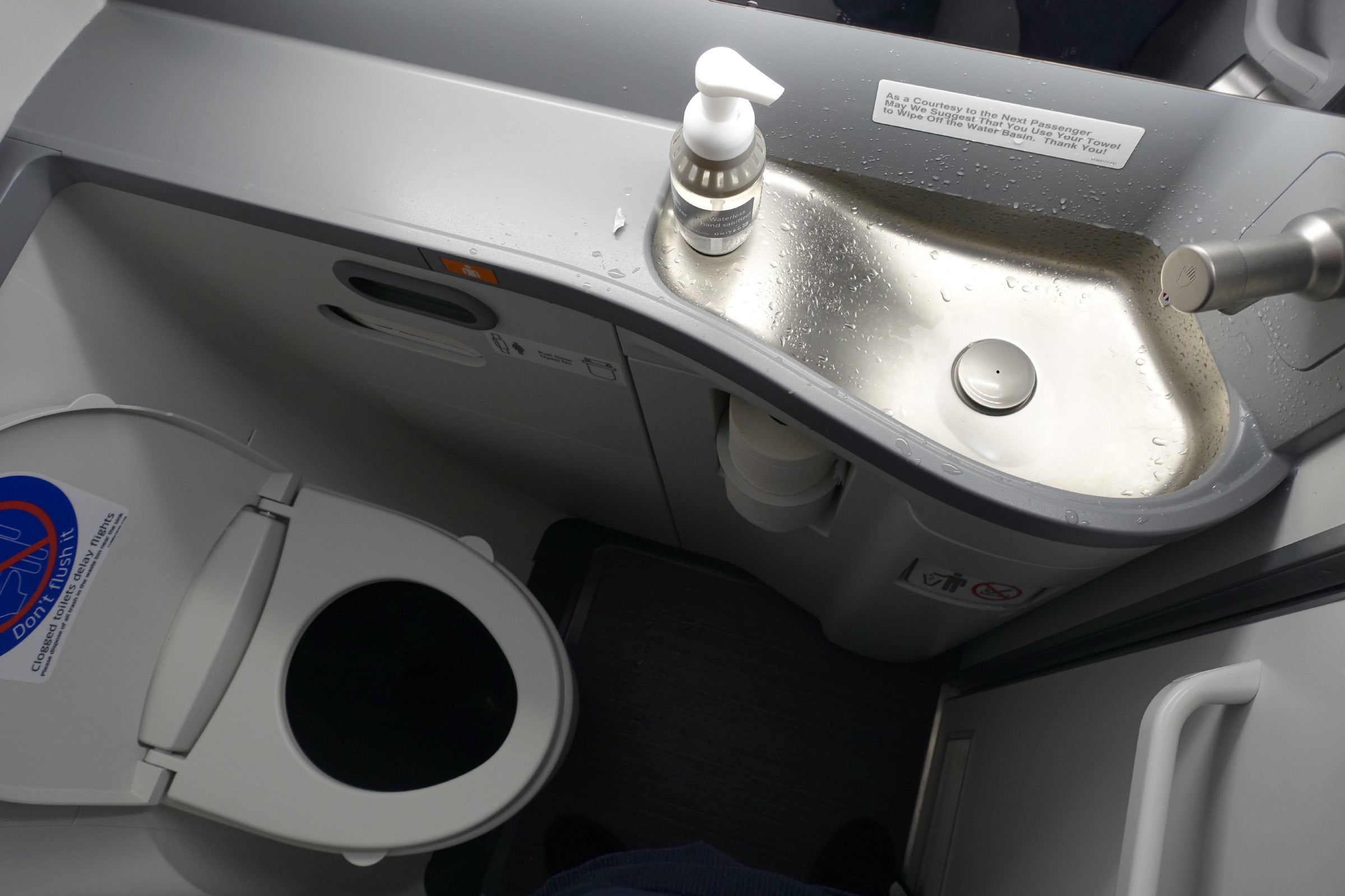The lavatory situation is far better in first class, too — the restroom is still quite compact, but it's more spacious than the three back in coach.