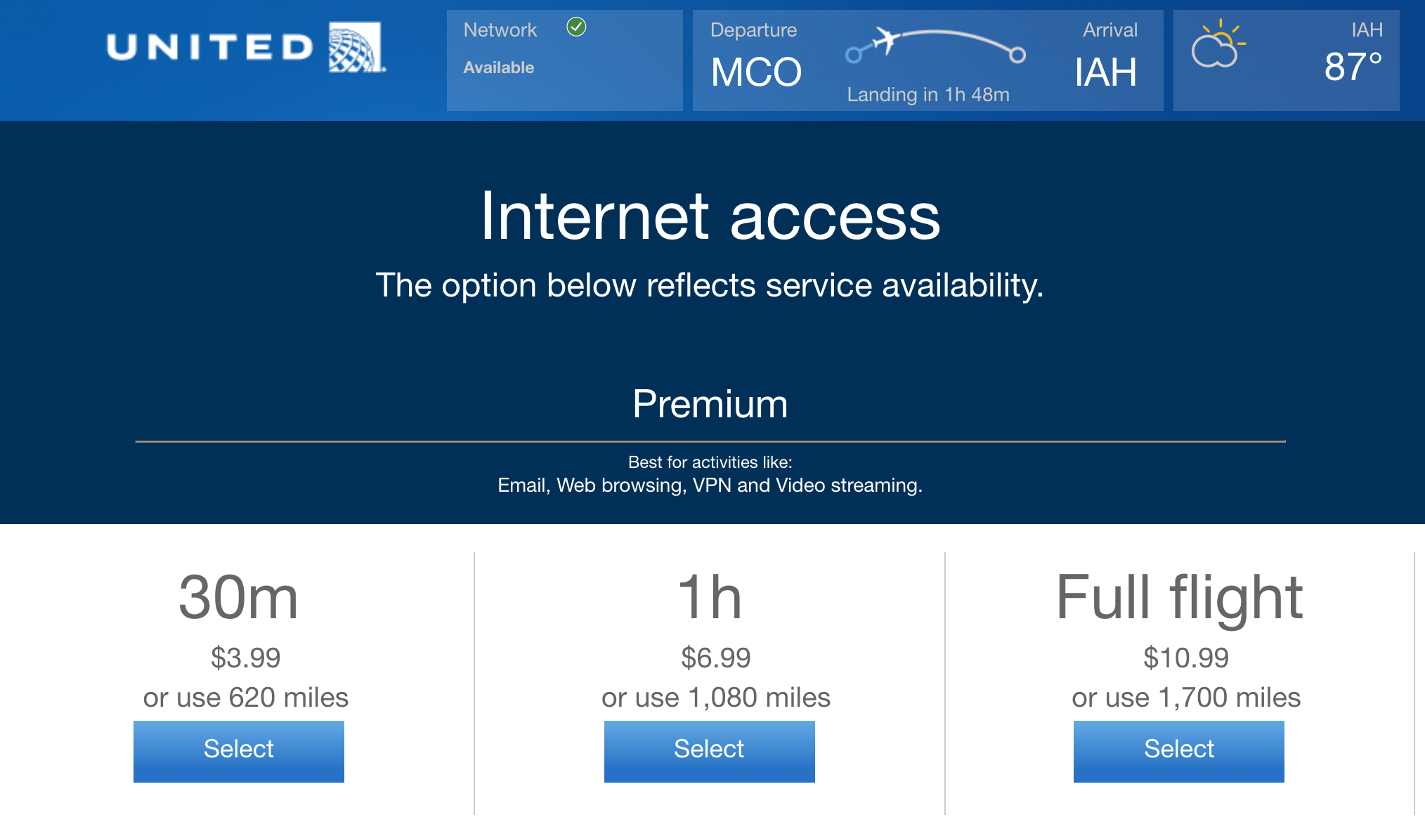 I was able to purchase a plan a few minutes after takeoff, with pricing as follows — Wi-Fi for the full flight cost $10.99:
