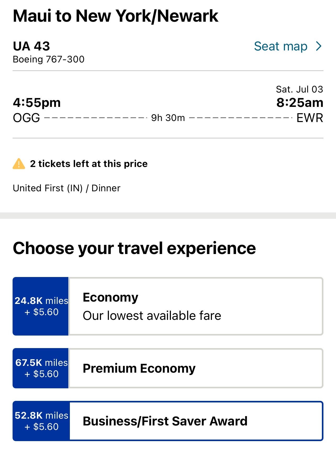 There was even saver availability on the morning of departure — TPG values 52,800 miles at $686, so booking this $1,400 flight with points would have definitely made sense.