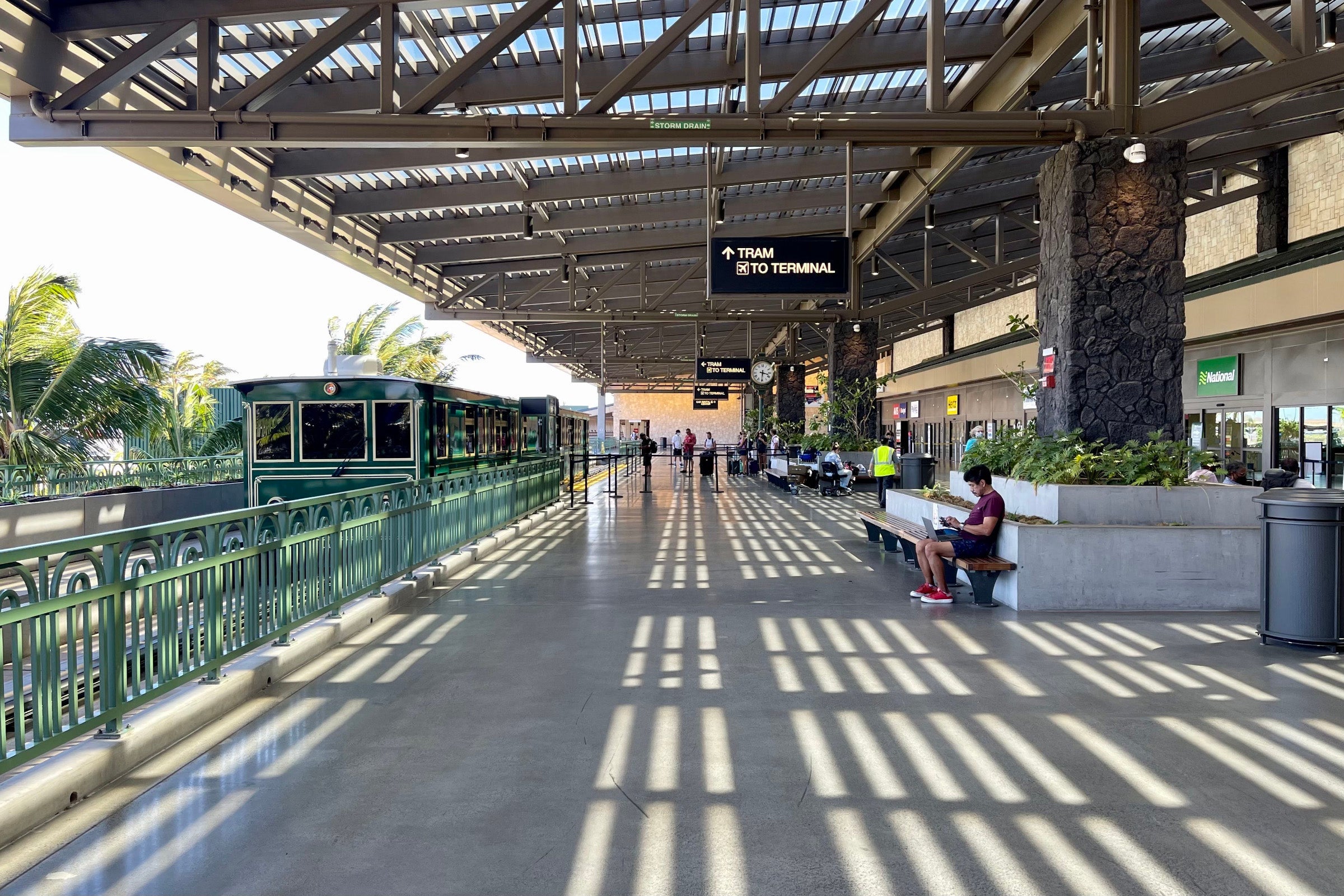 After dropping off our rental car at Maui's Kahului Airport, we walked roughly five minutes to the check-in counters. The pathway is large enough to accommodate a wheelchair, and there's a tram available as well.