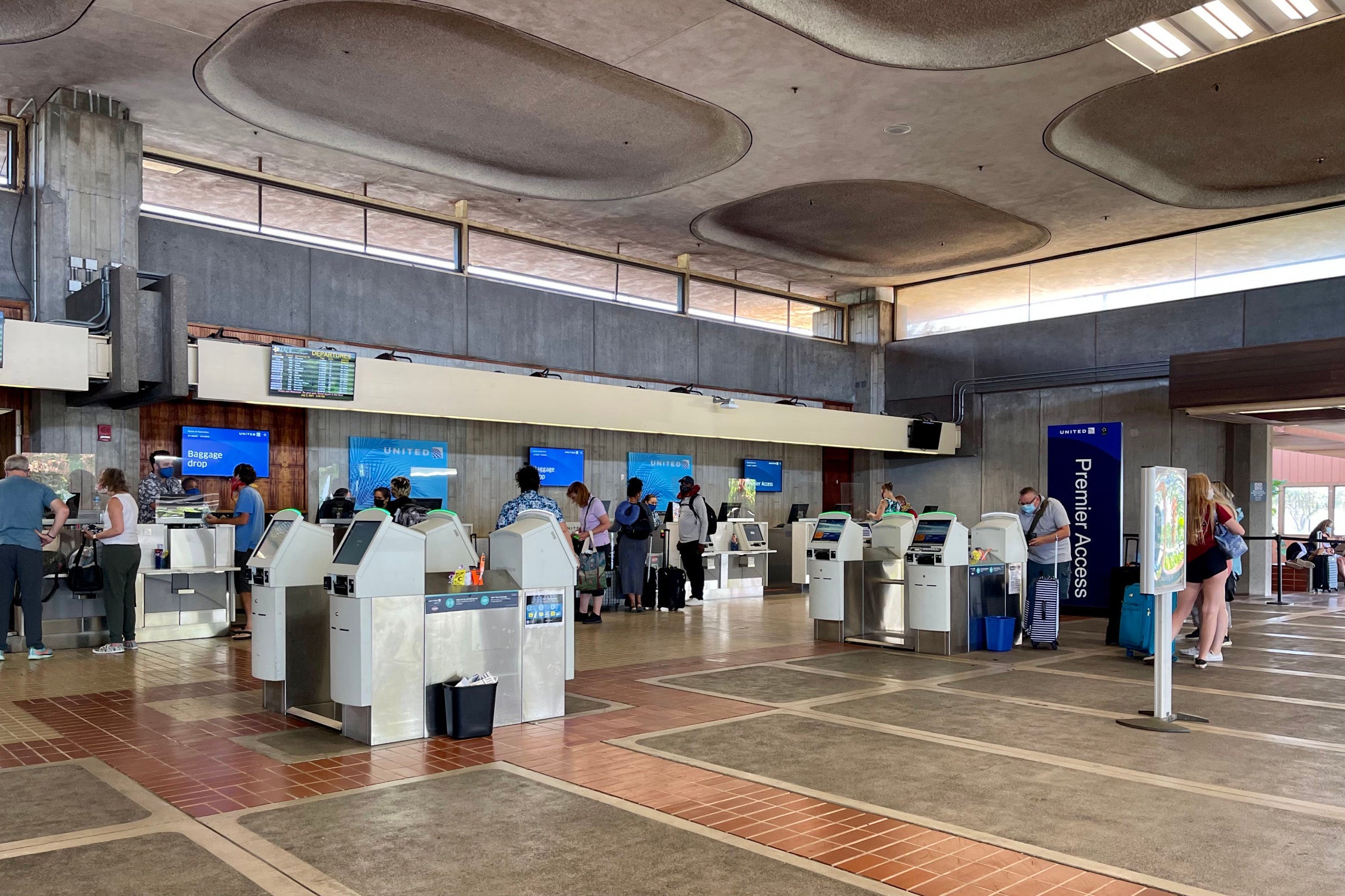 We ran our luggage through the state's requisite agriculture X-ray screening, then walked over to the relatively quiet United check-in area, where we tagged our own checked bags and handed them over to an agent.