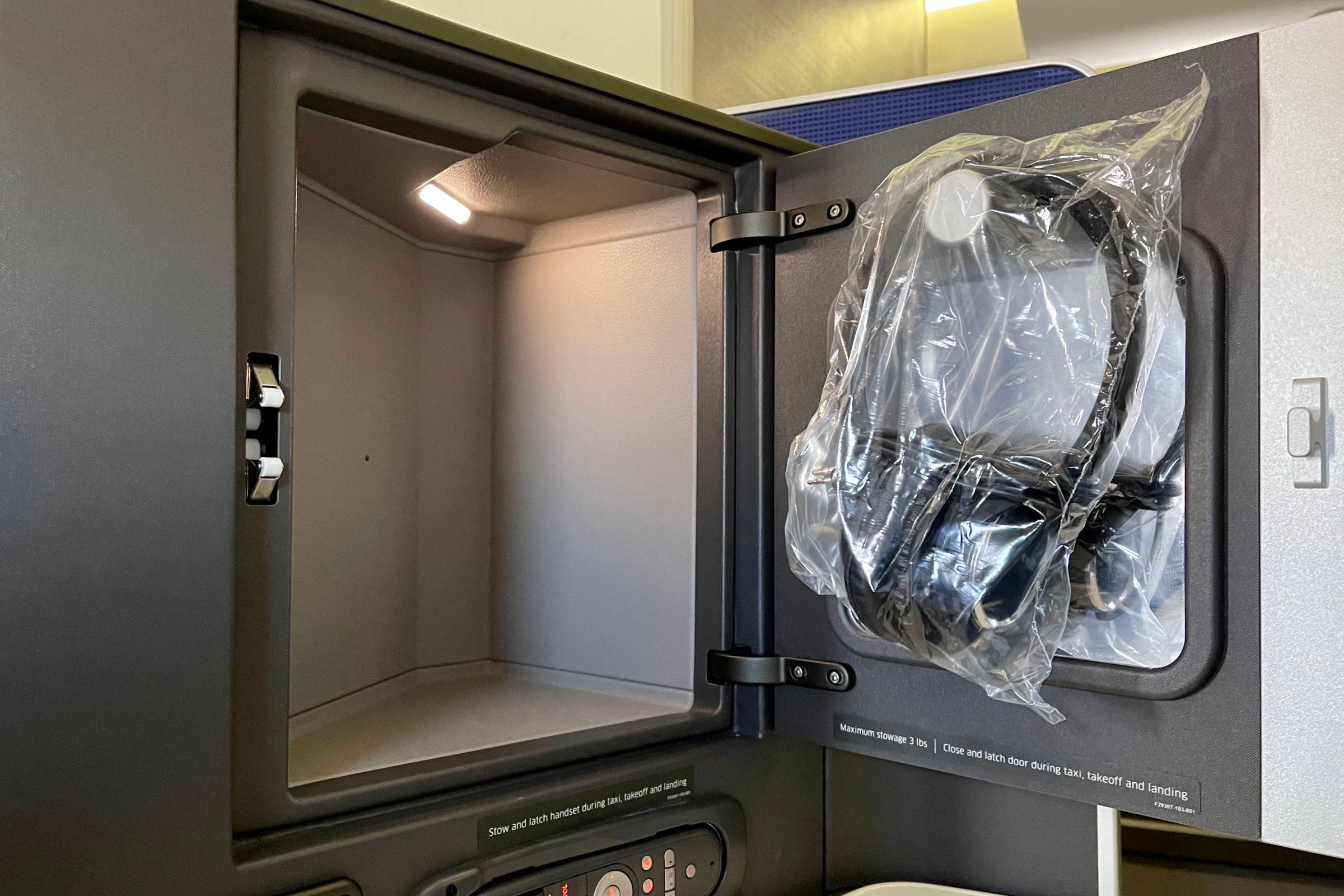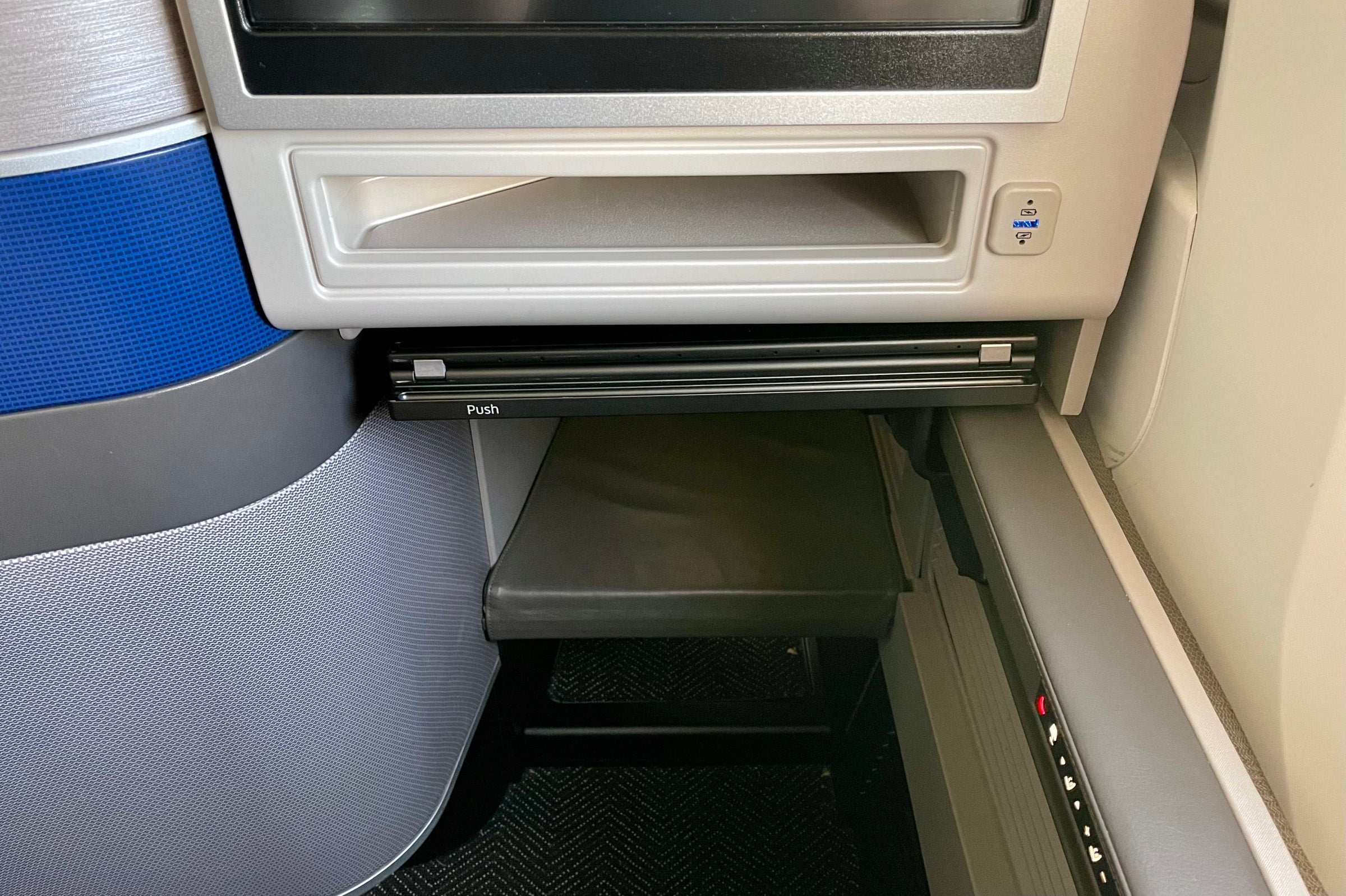 There's a fair amount of at-seat storage. In addition to a cabinet above the side table, there's a compartment below the TV, a footwell (which I used to store my backpack for takeoff and landing) and an additional area below.