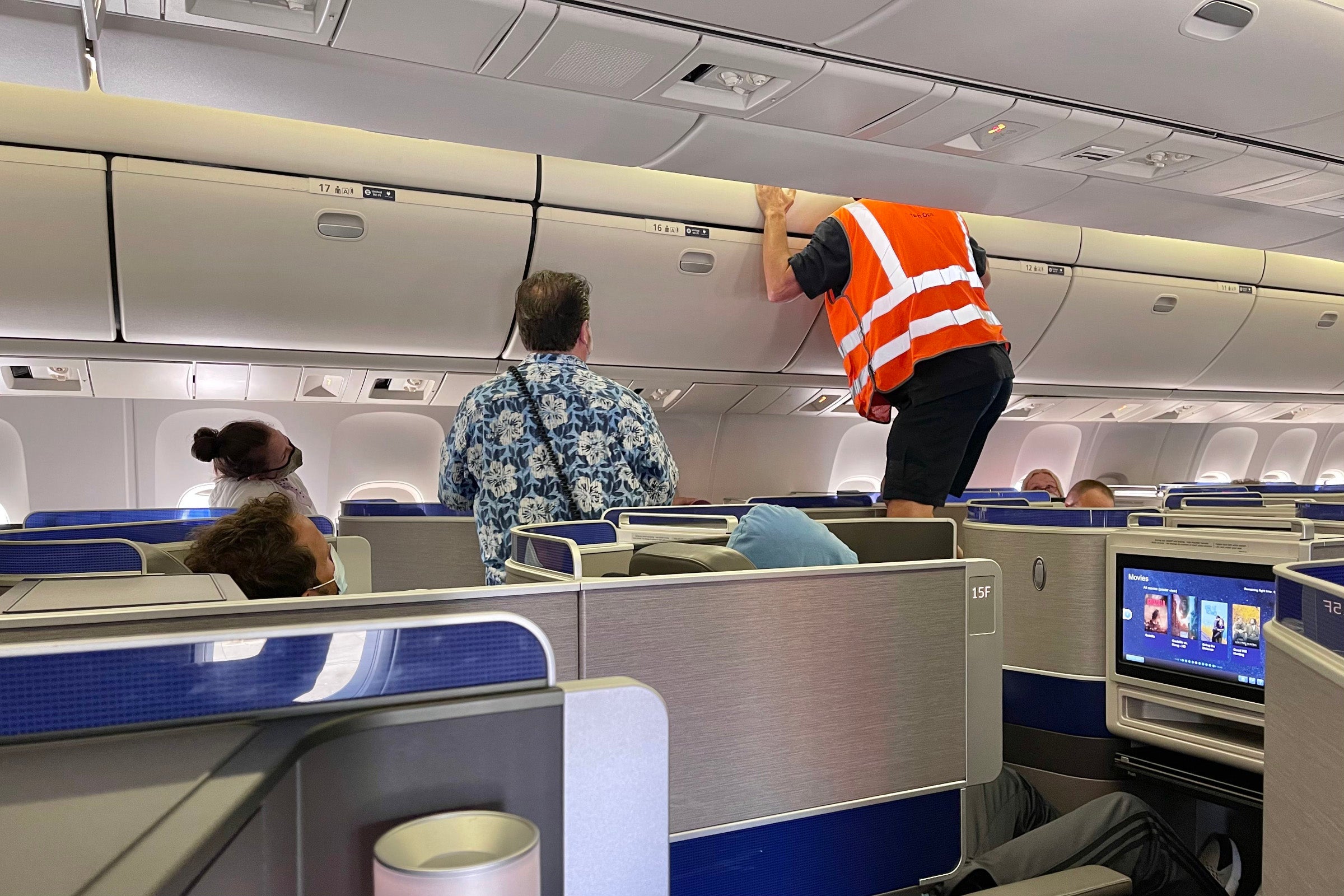 A couple of maintenance technicians arrived a few minutes later, and began tapping on the ceiling in an attempt to encourage the bird to fly toward the front of the plane.