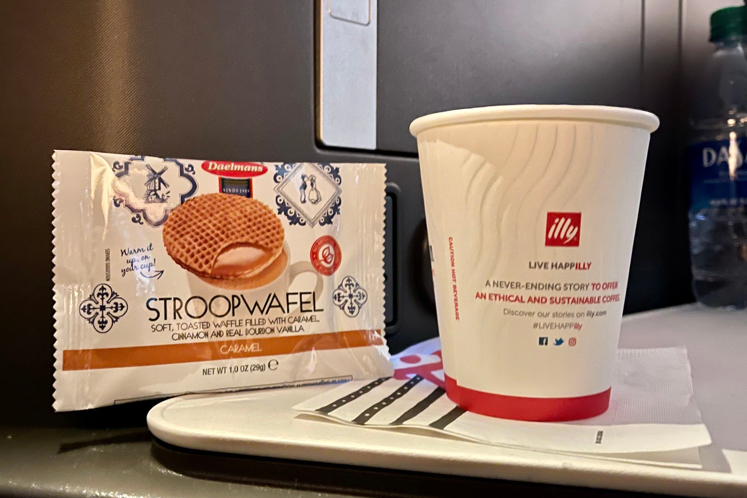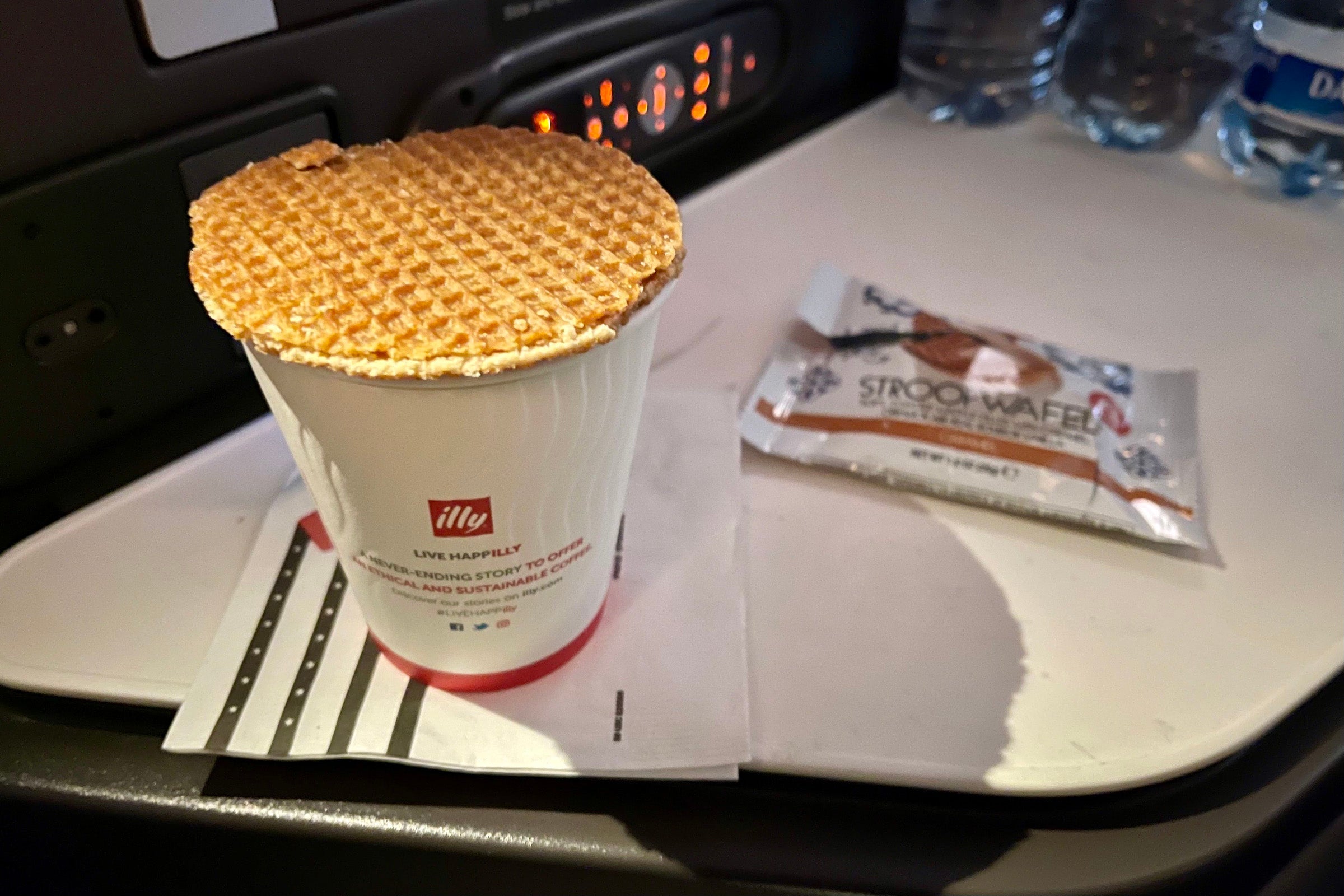 As we approached Newark, I asked about breakfast, worried that I had missed it. Believe it or not, United doesn't offer breakfast on this route — I was offered an economy stroopwafel and coffee, instead.