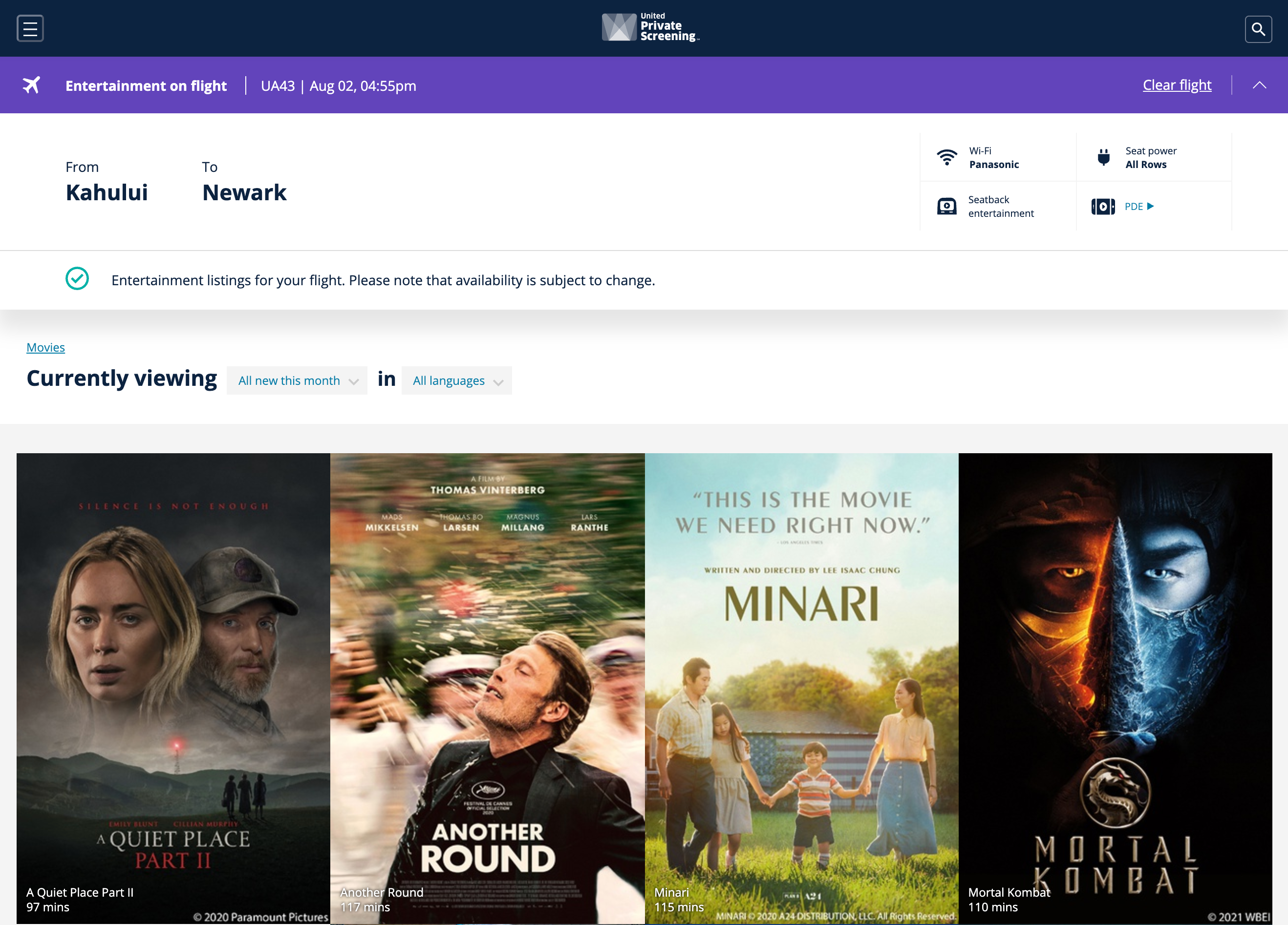 The airline typically updates its selection at the beginning of each month. You can head to United's dedicated Private Screening website here to find the current offerings for your flight.