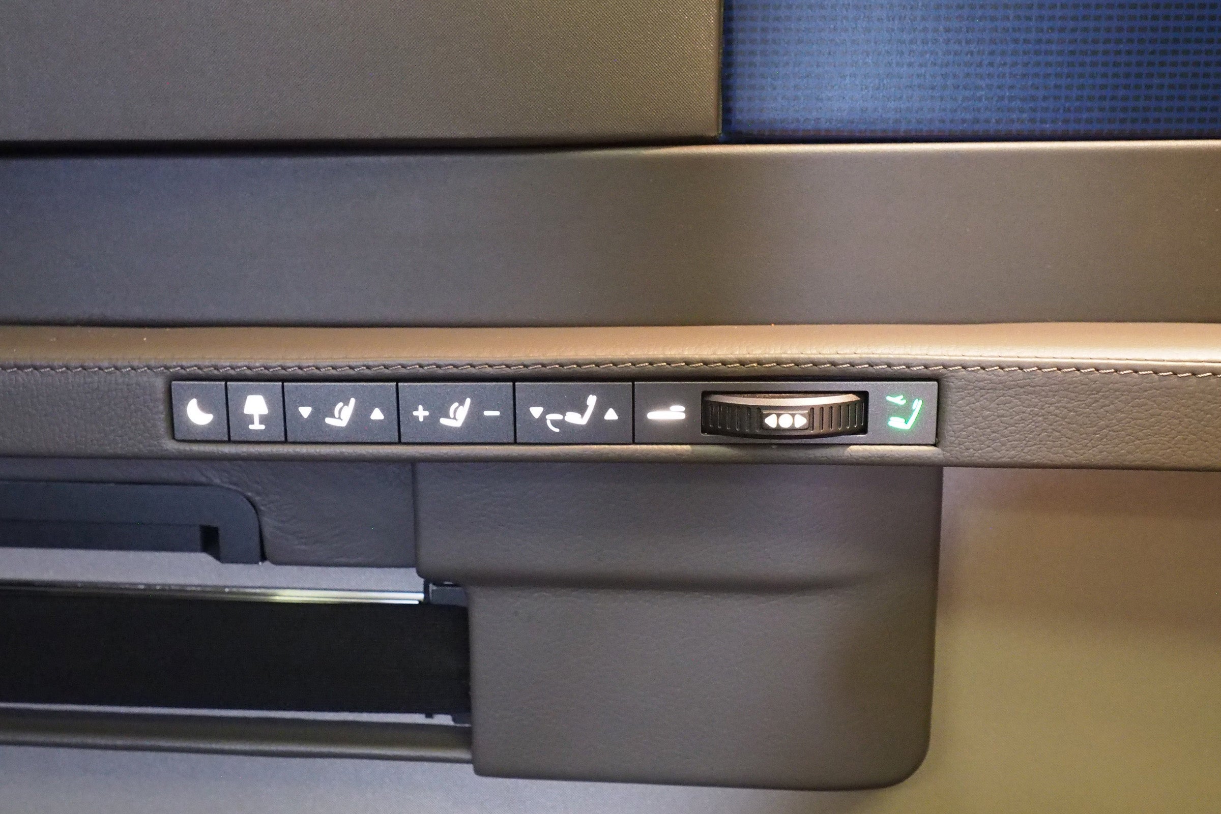 You can adjust the seat using an intuitive control wheel — it's also possible to make granular adjustments, but I didn't have any trouble getting comfortable just by moving the wheel forward and back. I was surprised to see that the passenger seated in 7F had an inoperable control panel, though, especially since this was the very first post-retrofit flight on this plane.
