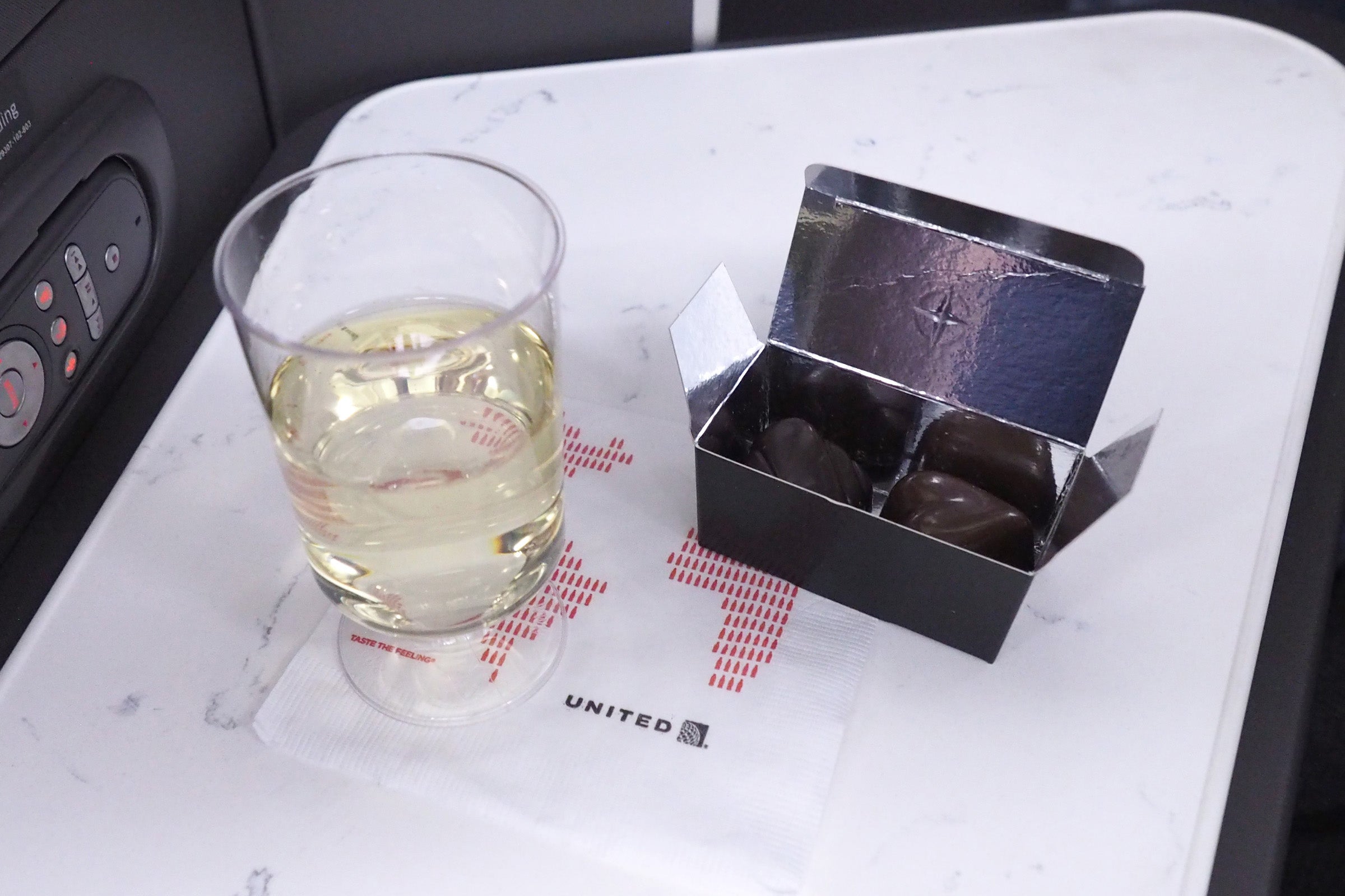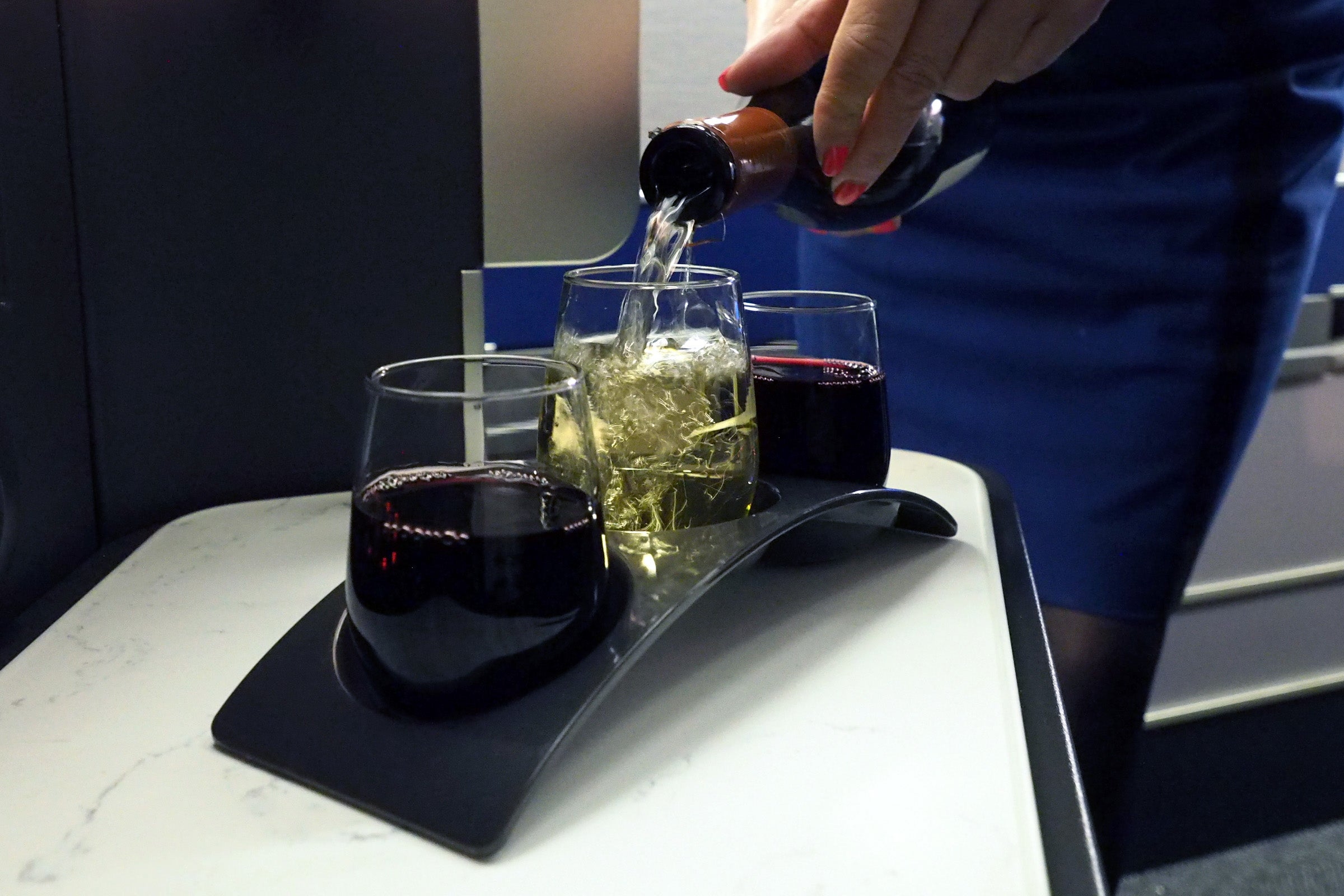Then, an hour and 15 minutes into the flight (yes, really — it was that long), a flight attendant came by to take my drink order. I requested the wine tasting, with two reds and one white.