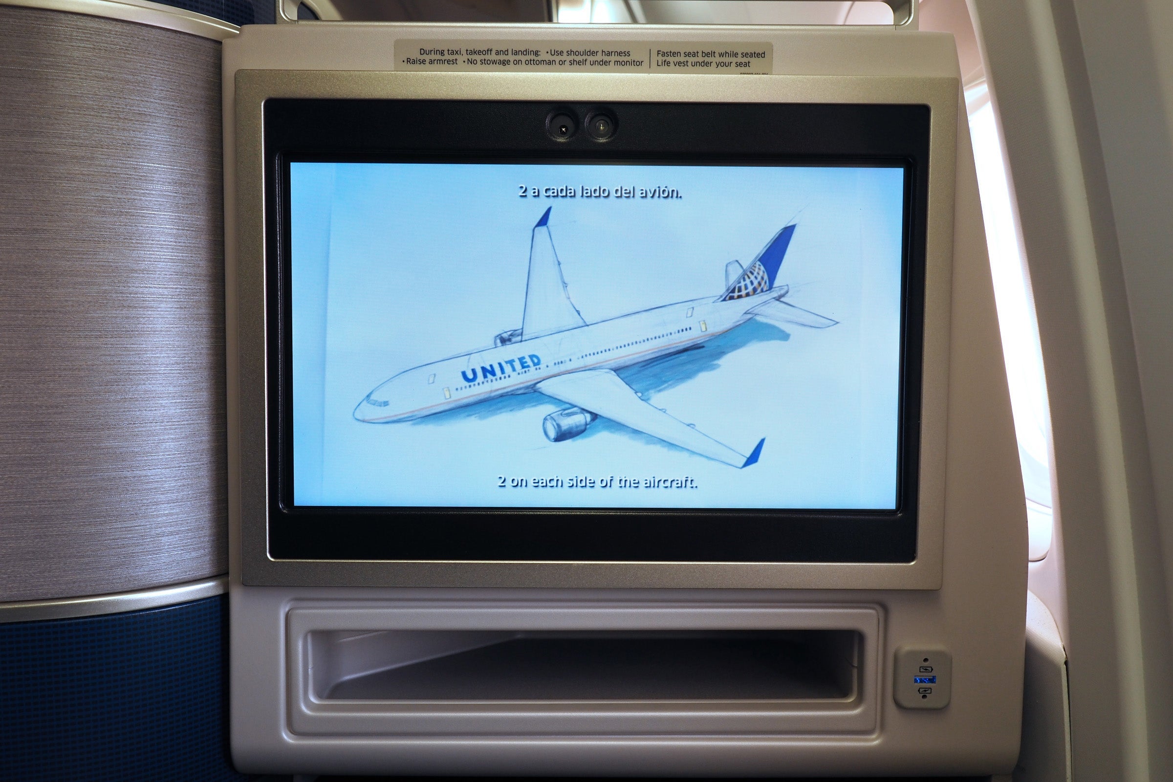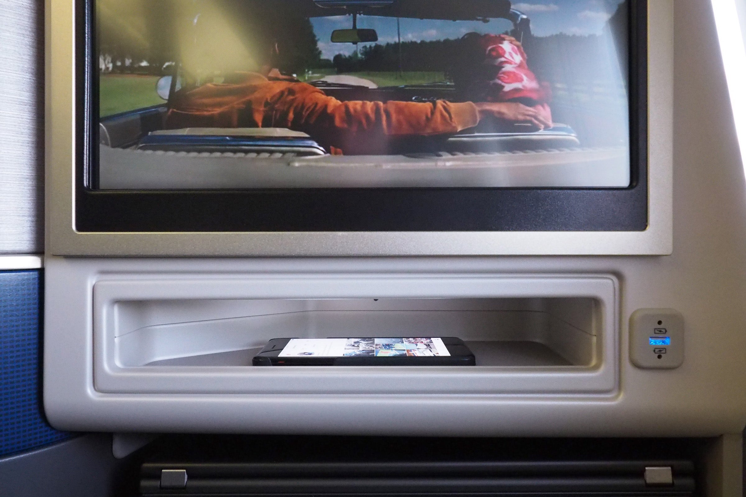 There's a small storage shelf just below the TV — with a USB power port to the side, this is generally where I choose to store (and charge) my smartphone during Polaris flights.