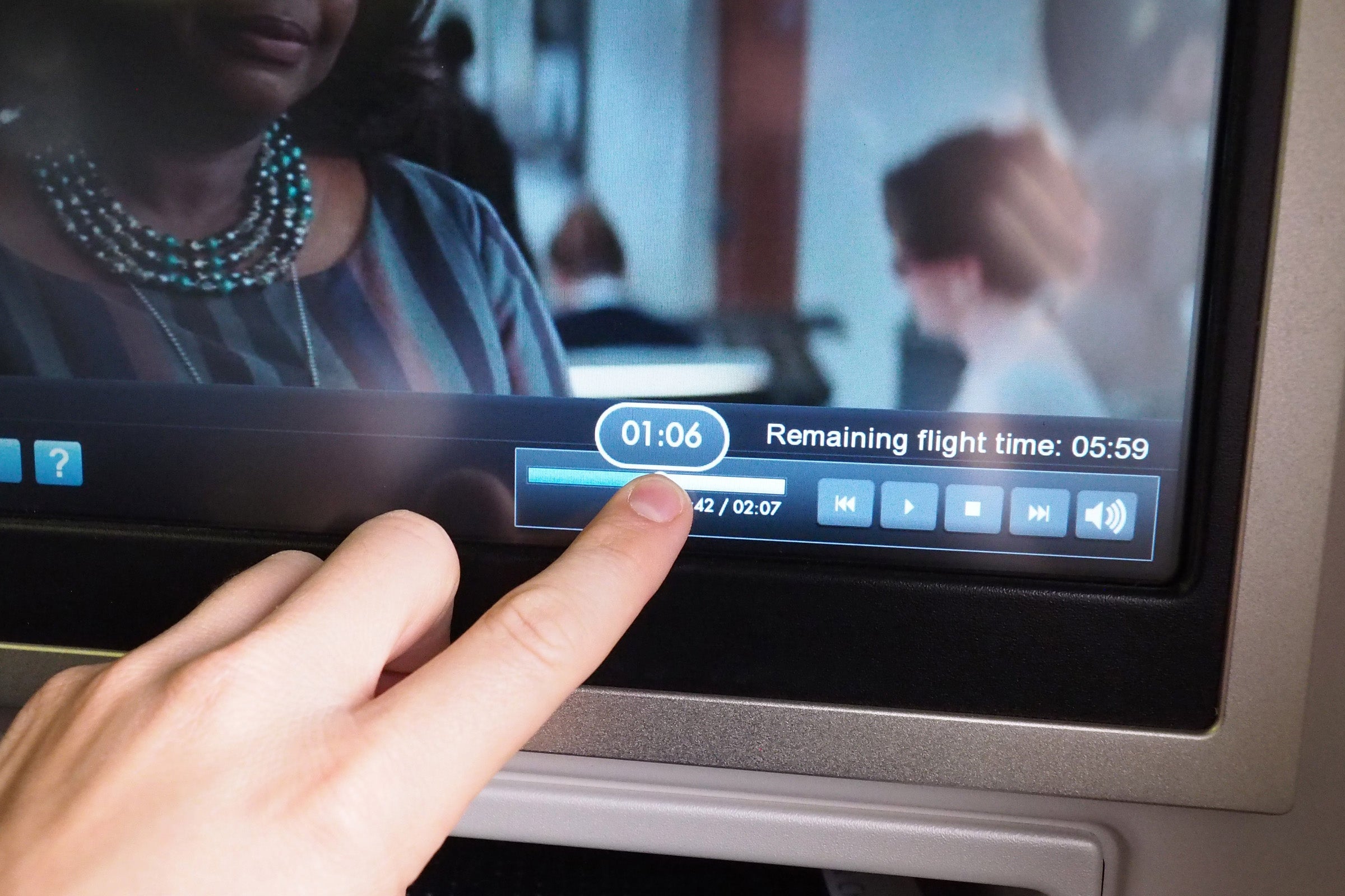 Each seat has a 15-inch HD touchscreen with loads of on-demand movies and TV shows.