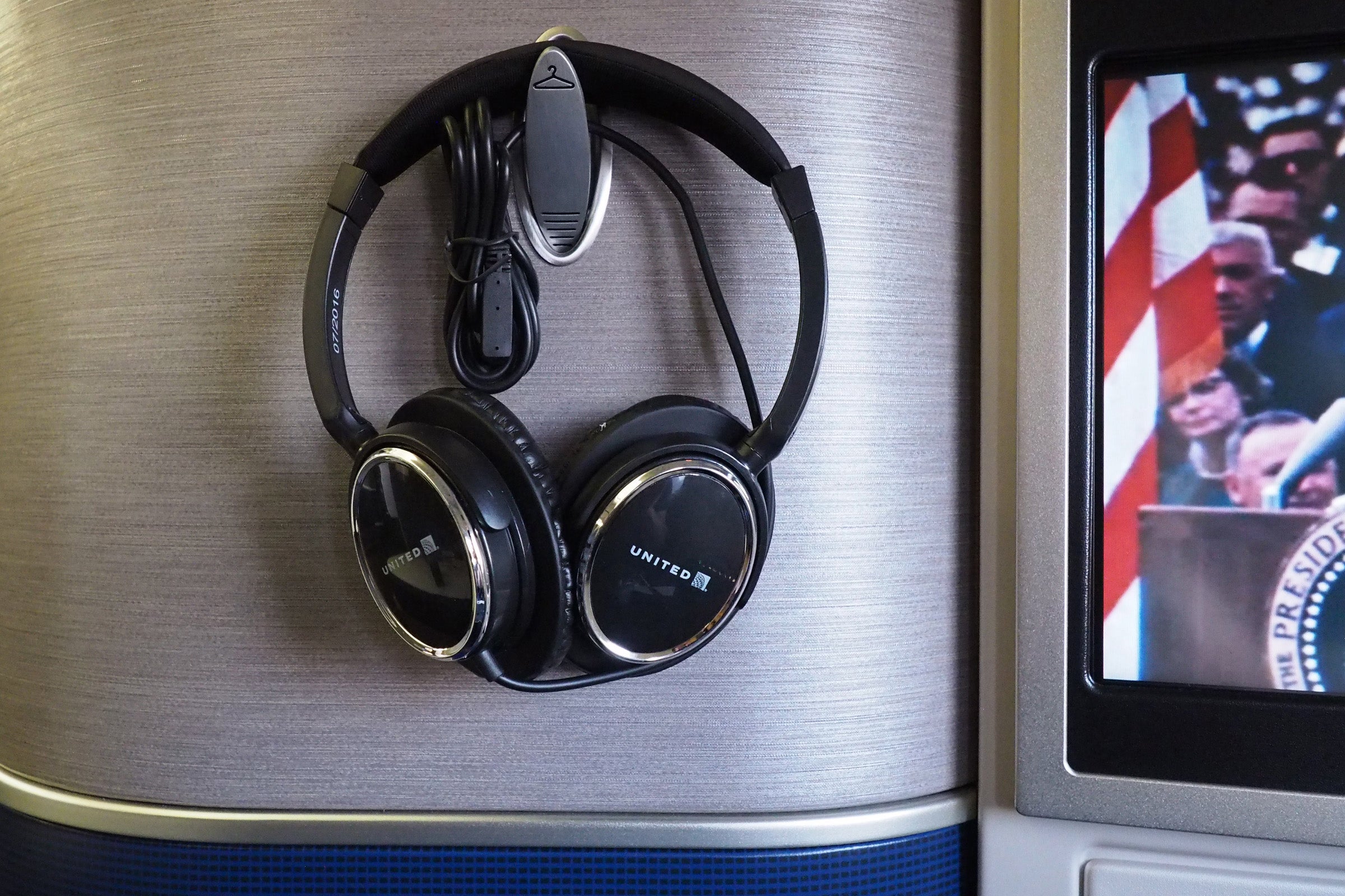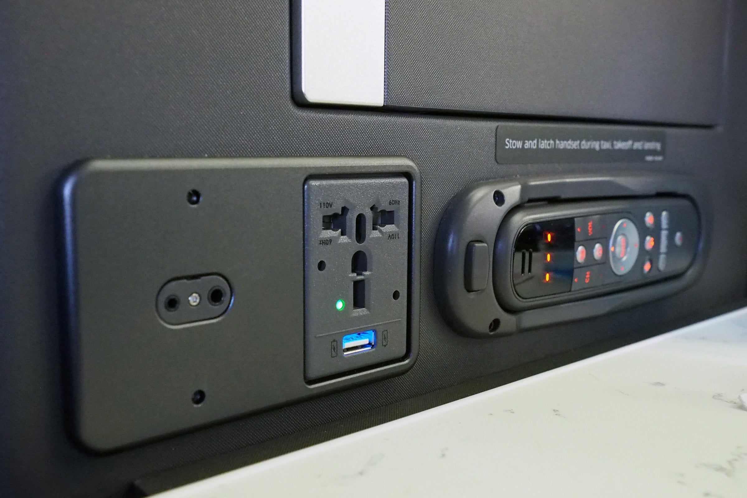 Above the side table you'll find a headphone jack, a universal power outlet, a second USB charging port (which wasn't working at my seat) and a wired remote.