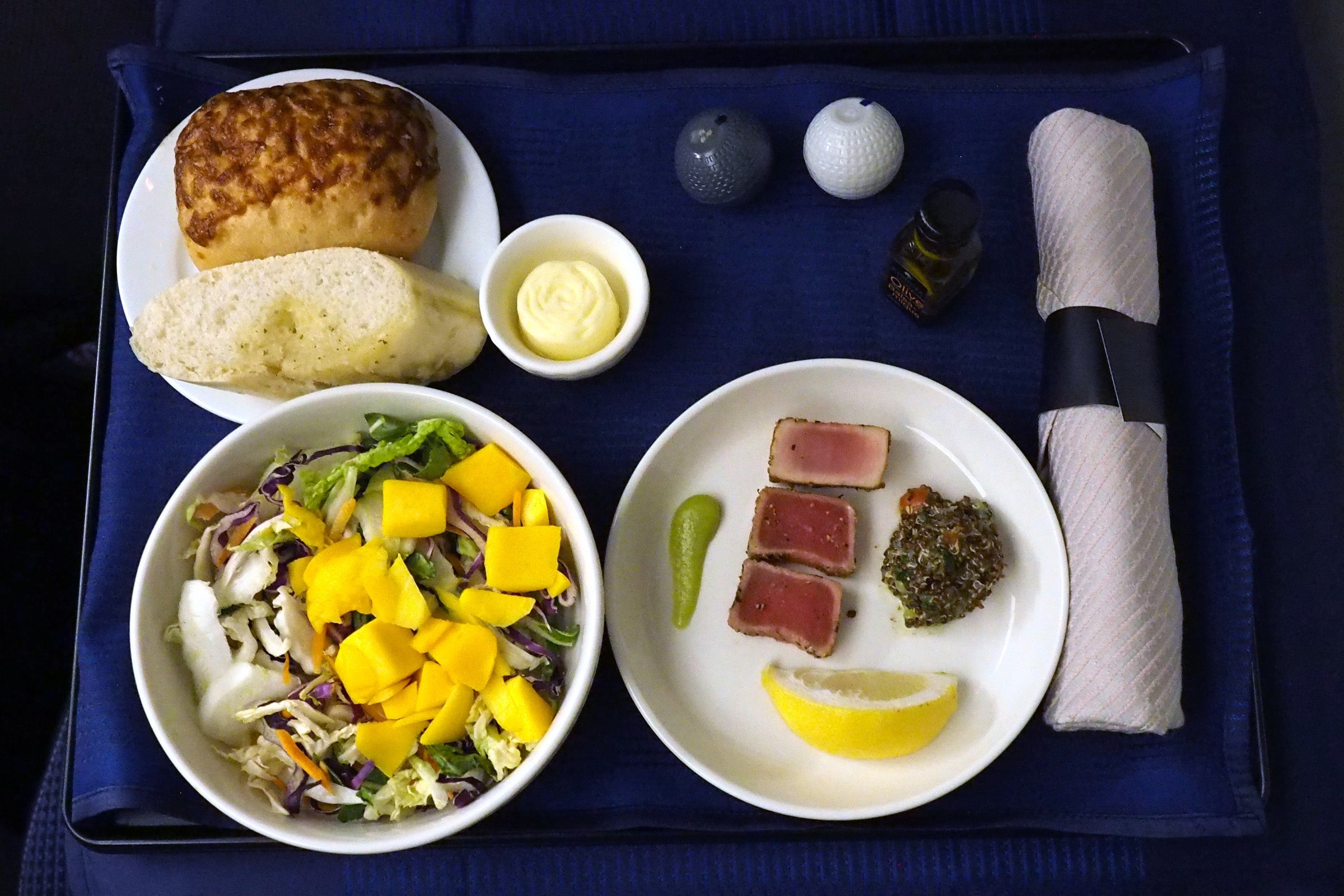 30 minutes after that (now an hour and 45 minutes after departure), the flight attendant brought my tray and appetizer. The bread wasn't warm enough, but the salad was interesting and fresh. I also liked the tuna appetizer.
