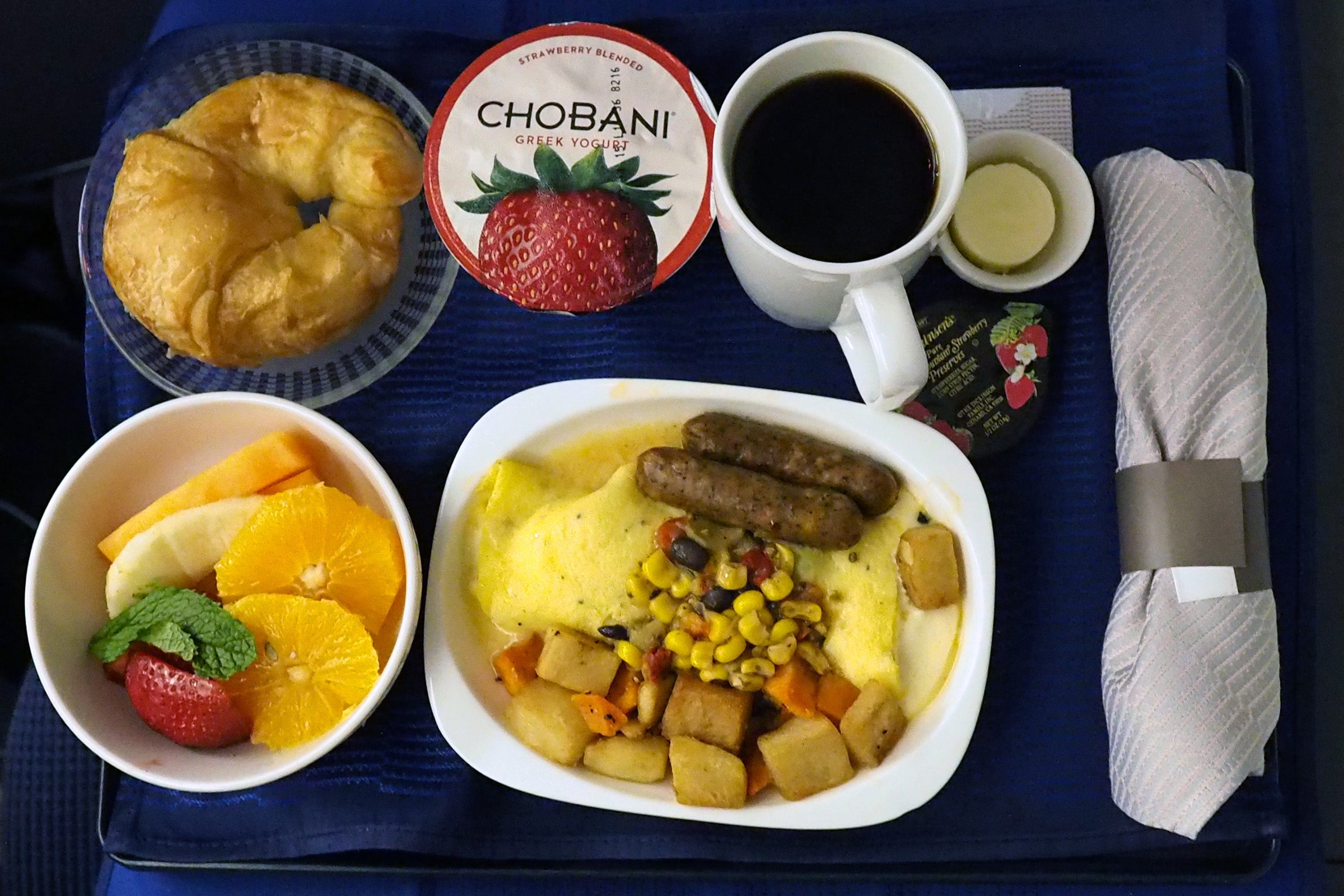 Because dinner took so long and the flight was so short, breakfast began less than two hours after dessert, or an hour before arrival. I missed the flight attendant the first time around, so I pressed my call button. (The one issue with these seats being so private is that it's nearly impossible to make eye contact with a flight attendant, so you really are dependent on the call button.) She didn't spot it initially, apparently, so I pressed it again and she appeared right away. My breakfast was served just two minutes later — and it was outstanding, especially the omelette with spicy cheese.