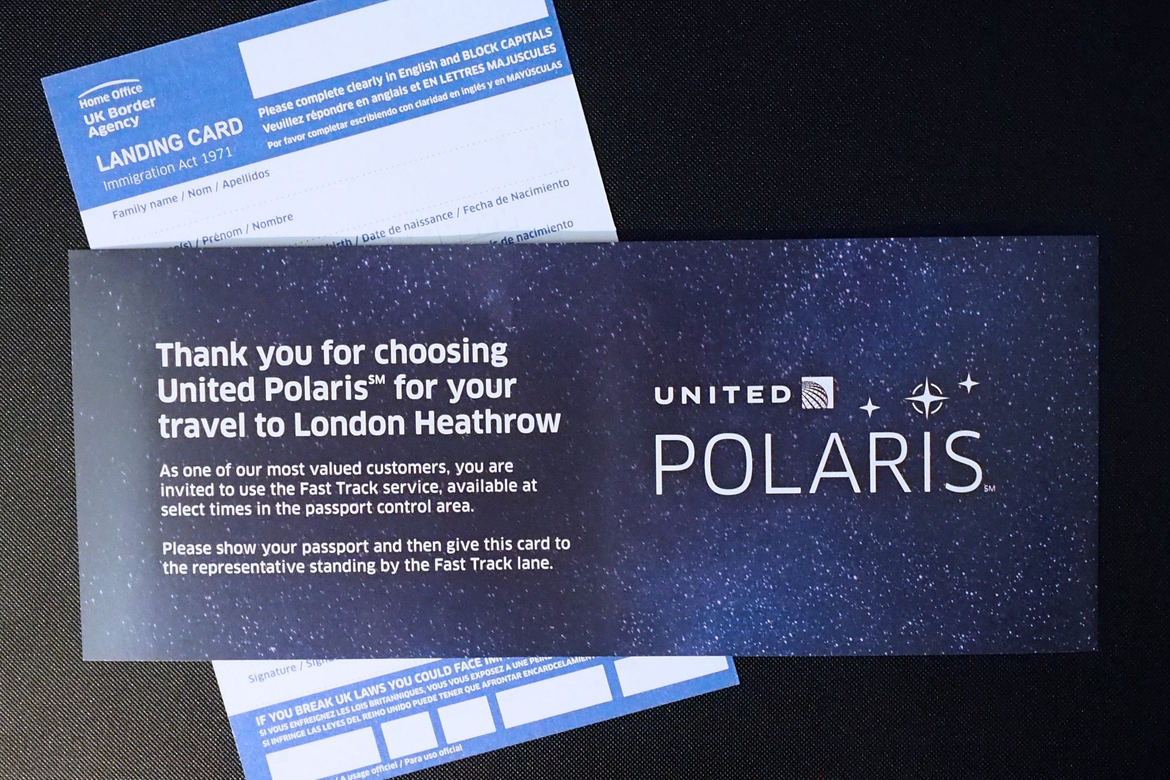 Just before landing, the purser came through with landing and Fast Track cards, which included instructions for visiting the United Arrivals Lounge at Heathrow.