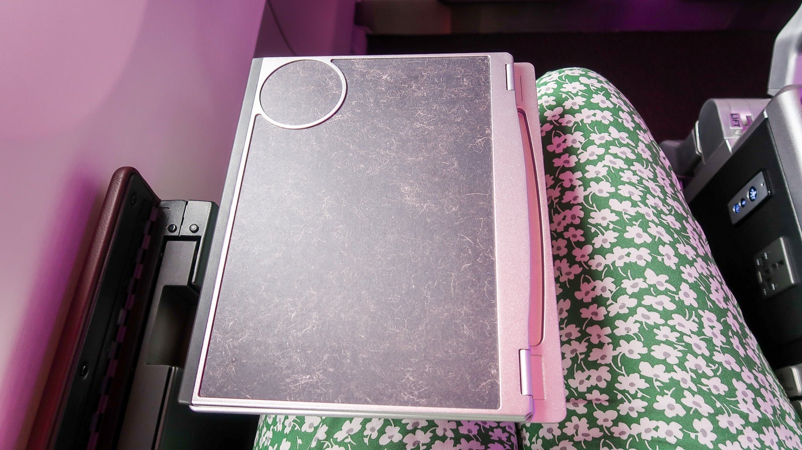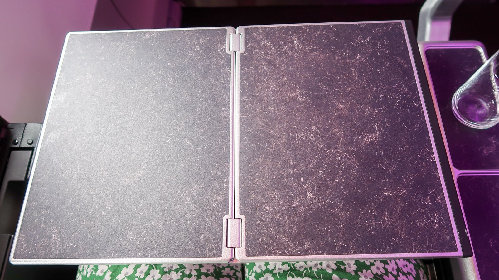 For each of the seats in the cabin, the tray table ejected from underneath one of the armrests. It was a bifold tray table, which was perfect for just a small plate or to rest a drink. In its folded position, most passengers had enough room to squeeze out to use the lavatory. Fully open, it was somewhat flimsy, though my 15-inch laptop could fit on it.