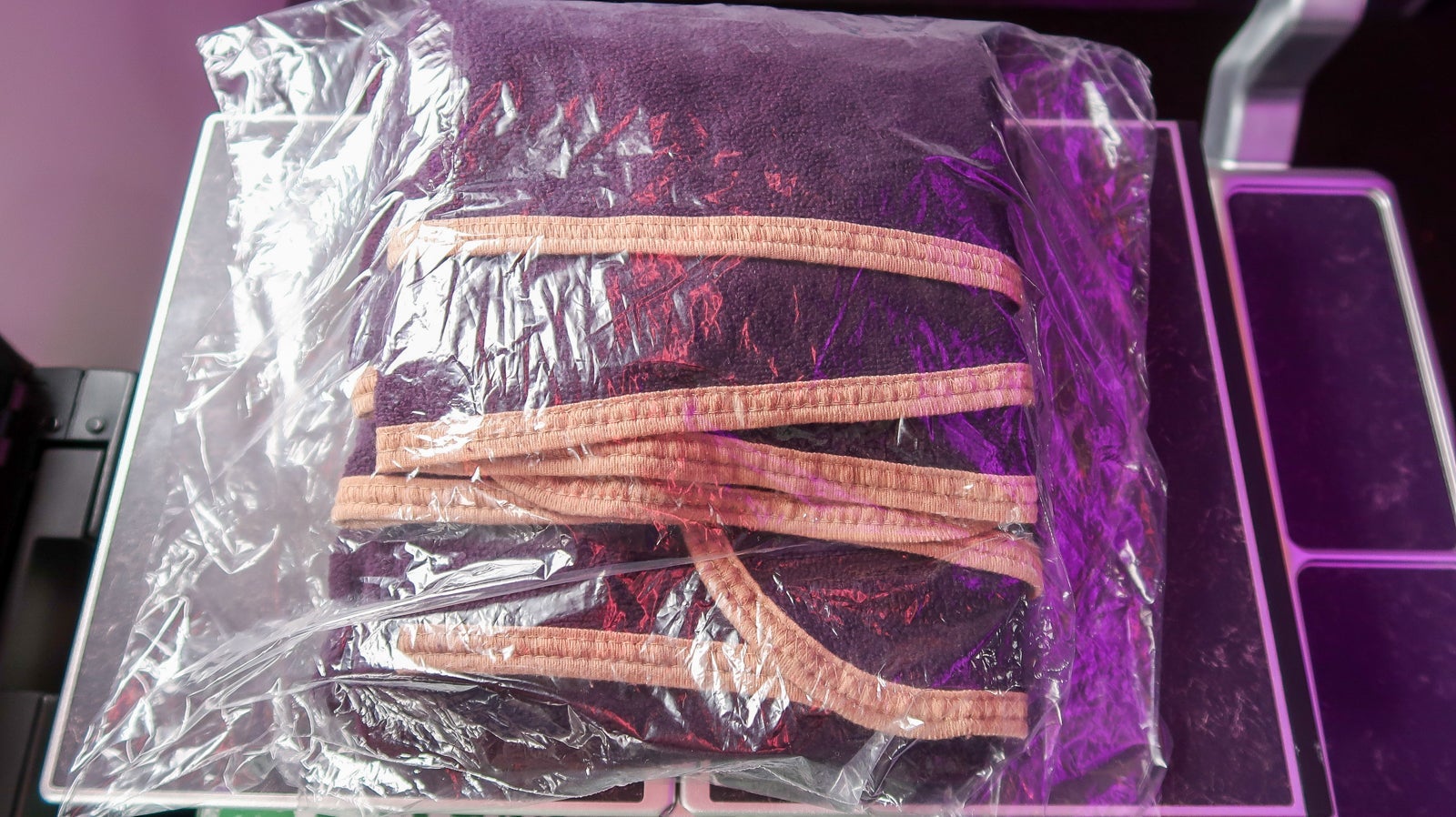 The blanket was a deep purple with gold trim. The fleece material of the blanket felt almost worn, but I liked that the blanket had a special neck cutout, which made it easier to cover yourself in an upright position in Premium or economy.