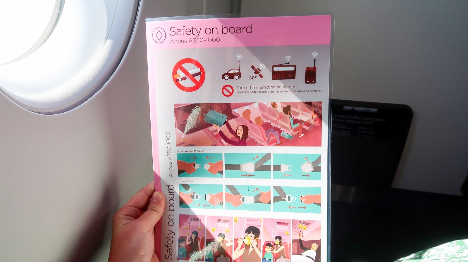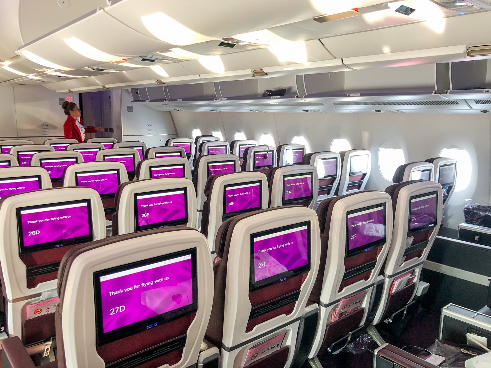 Upon entering, I definitely got that new-plane smell. Everything was fresh, and you could feel the excitement of the cabin crew. No tears in seat upholstery, no nicked corners or stained carpets. The aircraft showed its youth — especially considering that we were parked next to one of the oldest aircraft in the airline's fleet, an A340-600 that was brought out of retirement in February 2018.